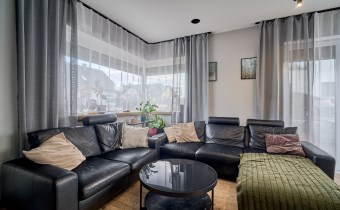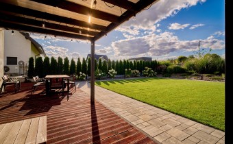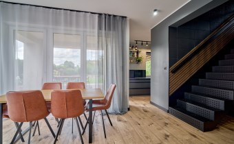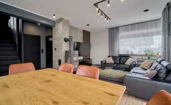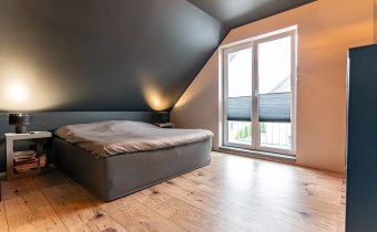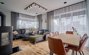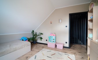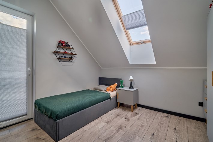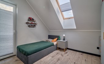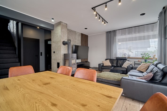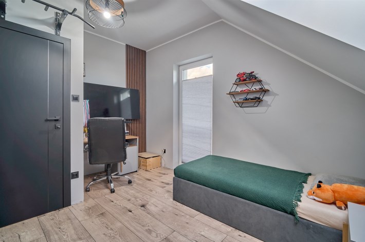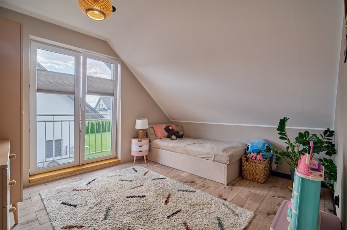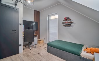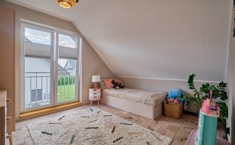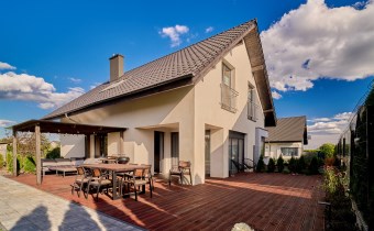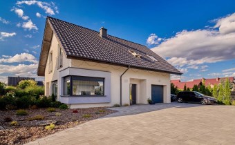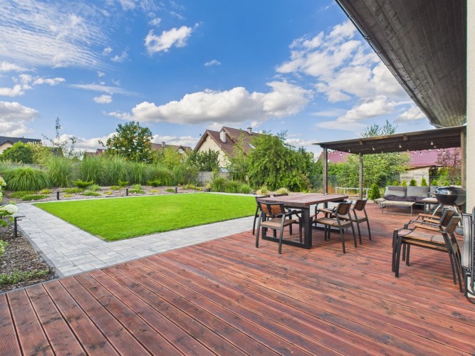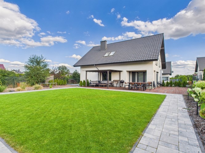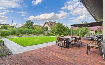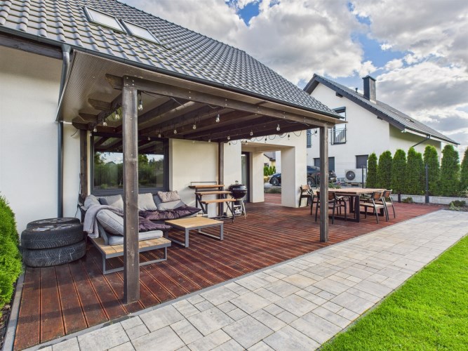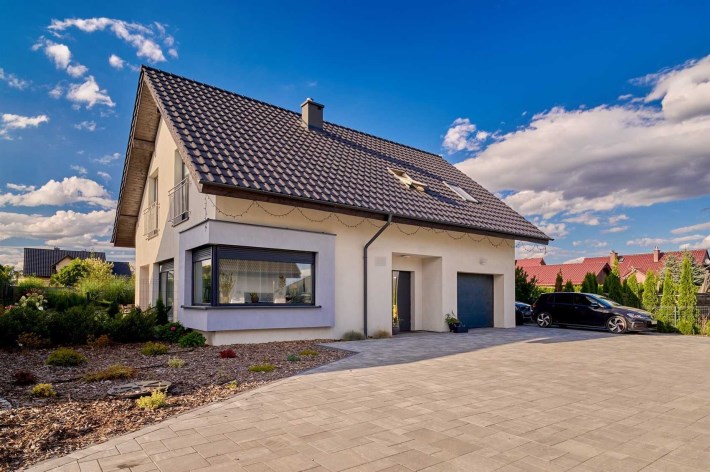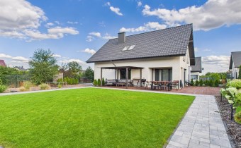 Z części dziennej prowadzi wyjście na rozległy, funkcjonalny taras, który podzielony został na część zadaszoną oraz słoneczną – idealną do wypoczynku. Teren posesji został kompleksowo zagospodarowany, z licznymi nasadzeniami ozdobnych krzewów i podjazdem wyłożonym kostką brukową.