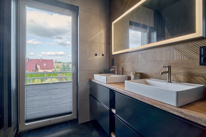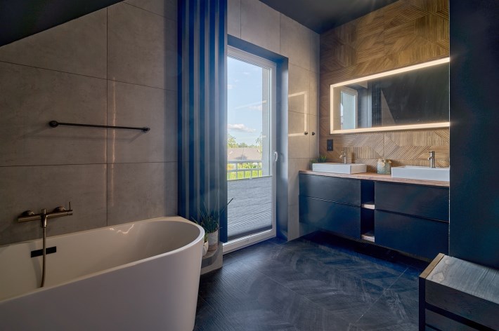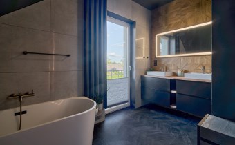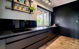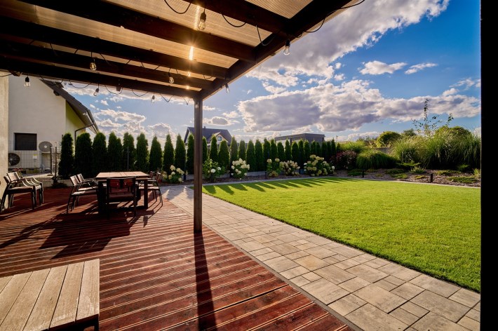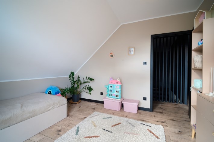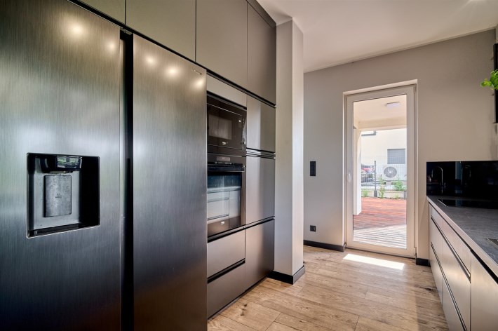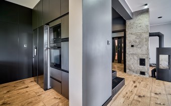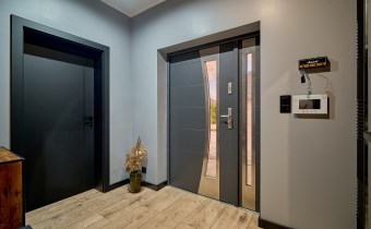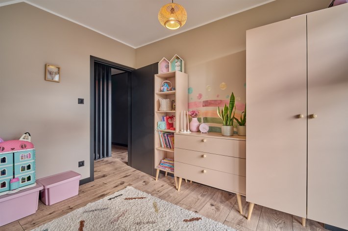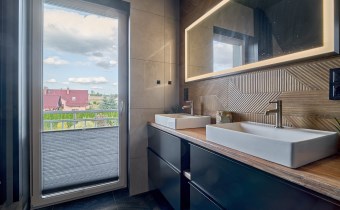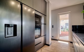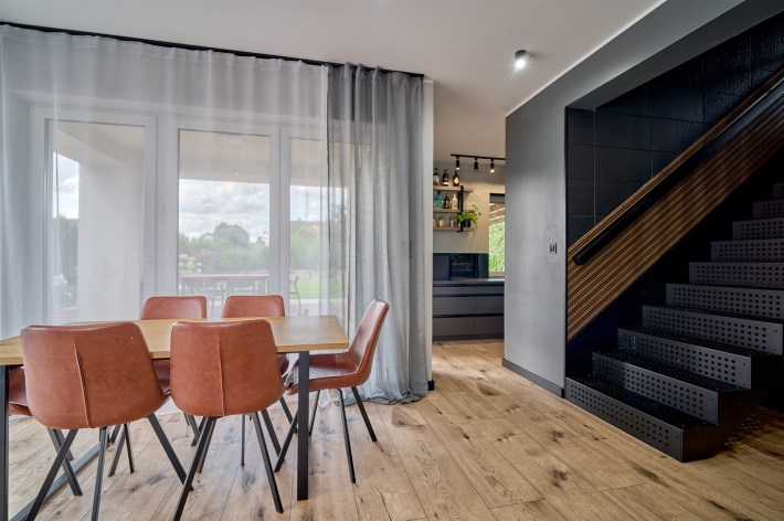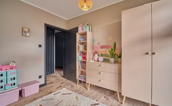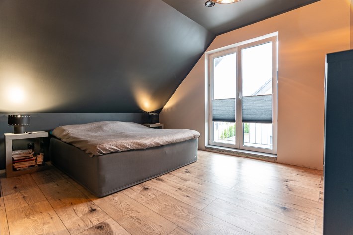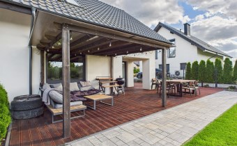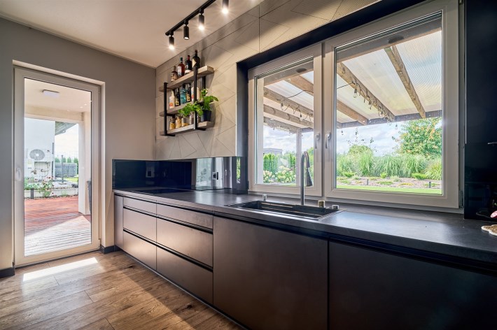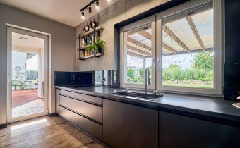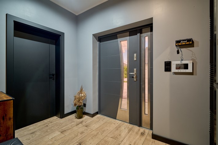Z części dziennej prowadzi wyjście na rozległy, funkcjonalny taras, który podzielony został na część zadaszoną oraz słoneczną – idealną do wypoczynku. Teren posesji został kompleksowo zagospodarowany, z licznymi nasadzeniami ozdobnych krzewów i podjazdem wyłożonym kostką brukową.