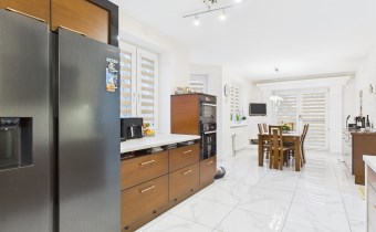Na parterze znajduje się przestronny salon z kominkiem z płaszczem wodnym (25m2), który tworzy przytulną atmosferę i jednocześnie wspomaga ogrzewanie domu. Z salonu prowadzi bezpośrednie wyjście na taras i do ogrodu, idealne miejsce do wypoczynku i spotkań z rodziną.