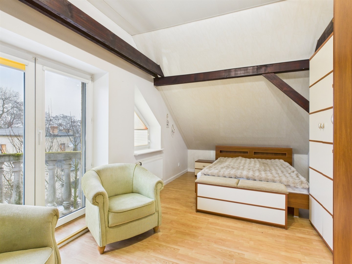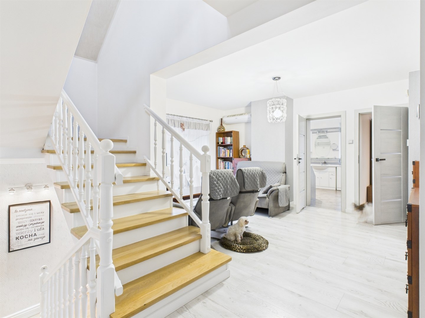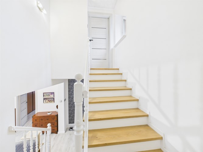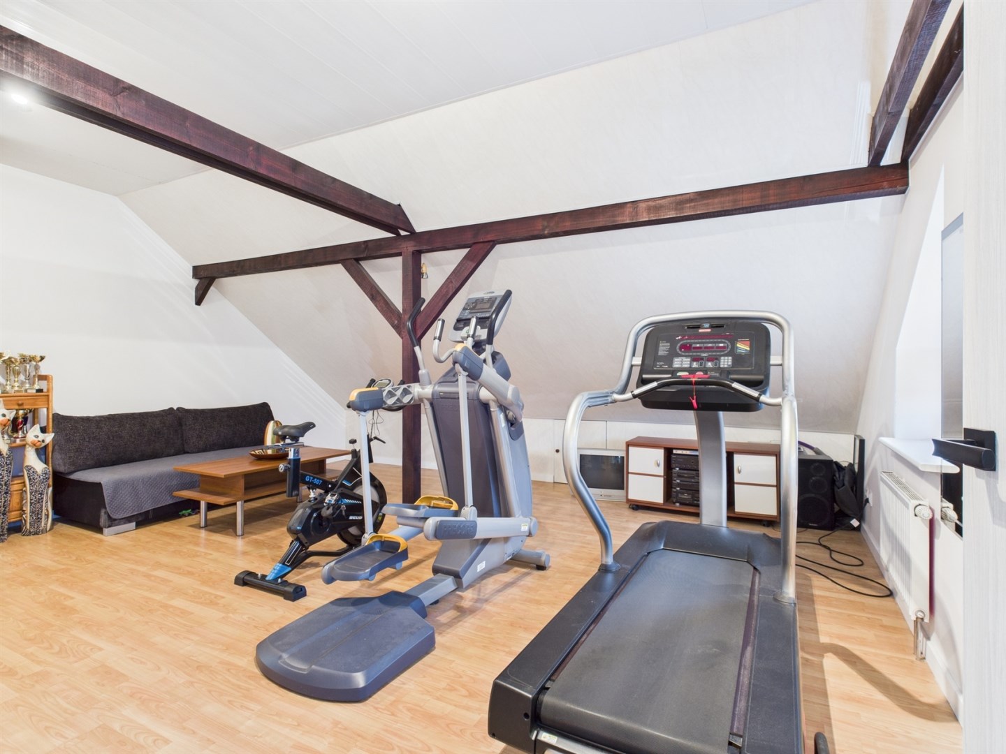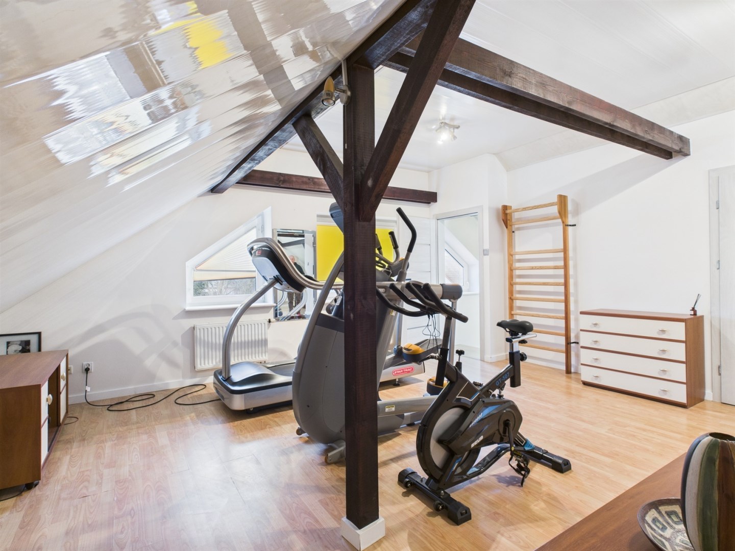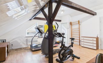 Poddasze oferuje dodatkową przestrzeń, którą można dostosować do własnych potrzeb. Znajduje się tu łazienka z WC, w pełni wyposażona siłownia oraz duża otwarta powierzchnia, idealna do stworzenia dodatkowych sypialni, gabinetu lub strefy hobby.