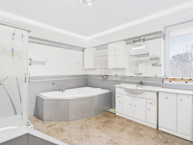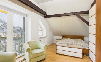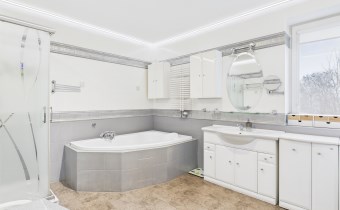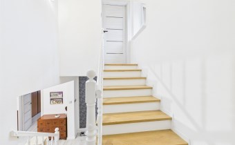 Piętro stanowi część prywatną domu. Znajdują się tu dwie ustawne sypialnie (24m2, 15,2m2), duża łazienka (11m2) wyposażona zarówno w wannę, jak i prysznic, a także komfortowy pokój dzienny / sala telewizyjna z klimatyzacją (27m2), który może pełnić funkcję rodzinnej strefy relaksu.