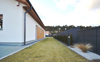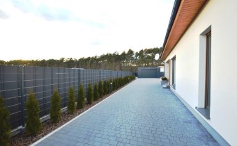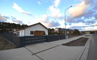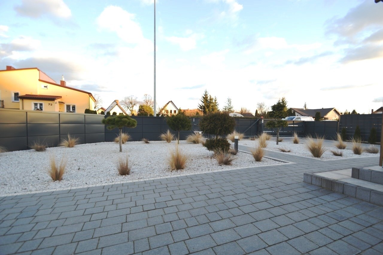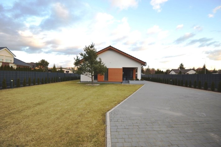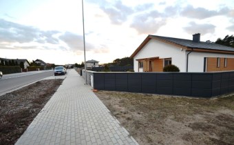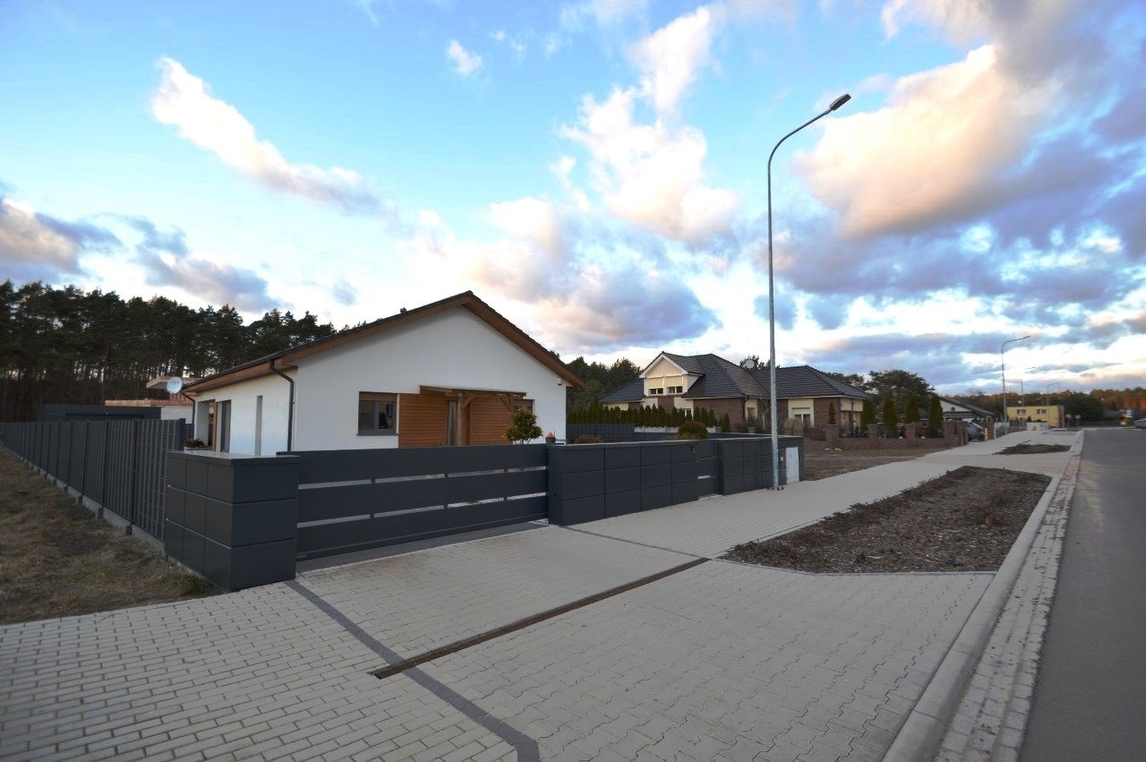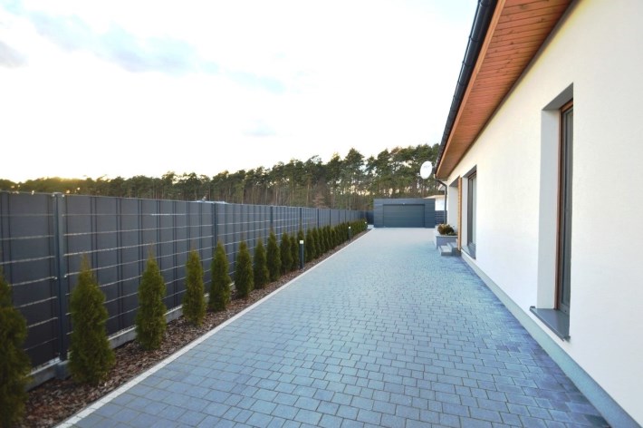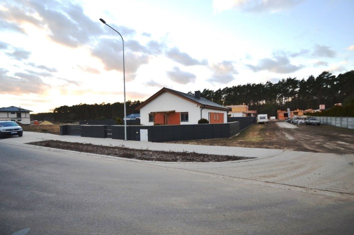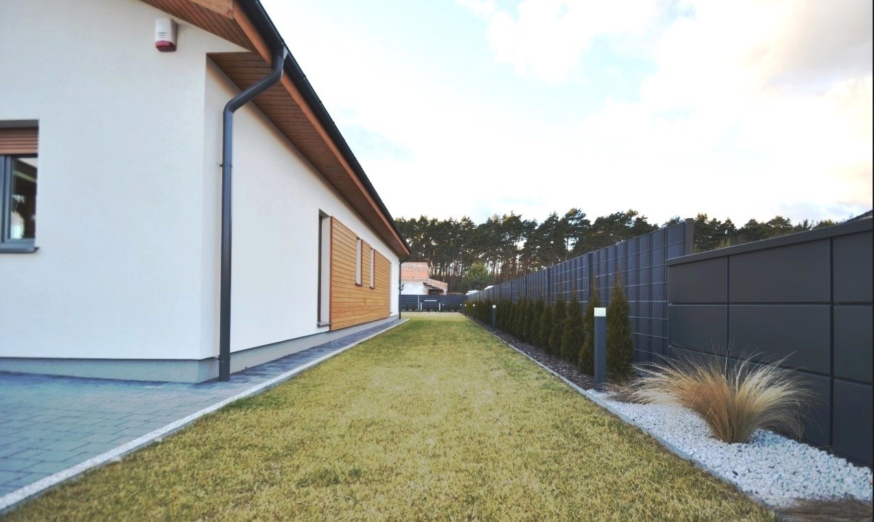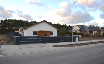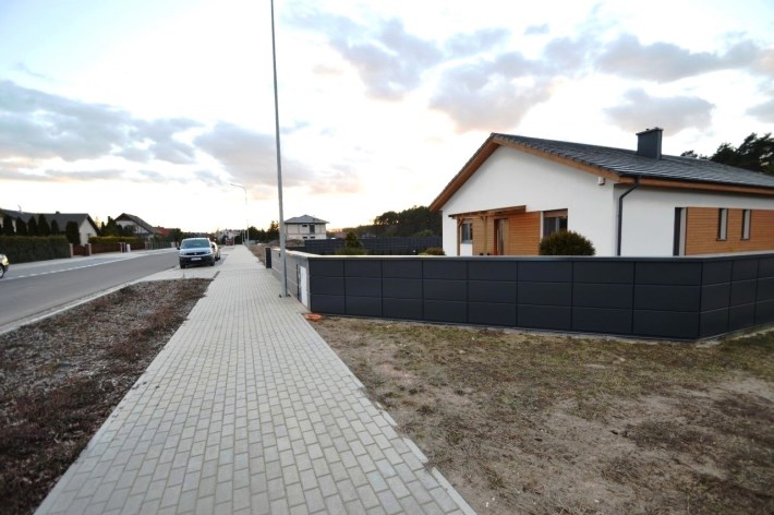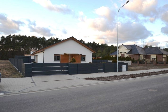 Od frontu wykonano ogrodzenie z elementów z blachy malowanej proszkowo, brama wjazdowa na pilota, furtka z zamkiem magnetycznym, obsługiwanym z domu