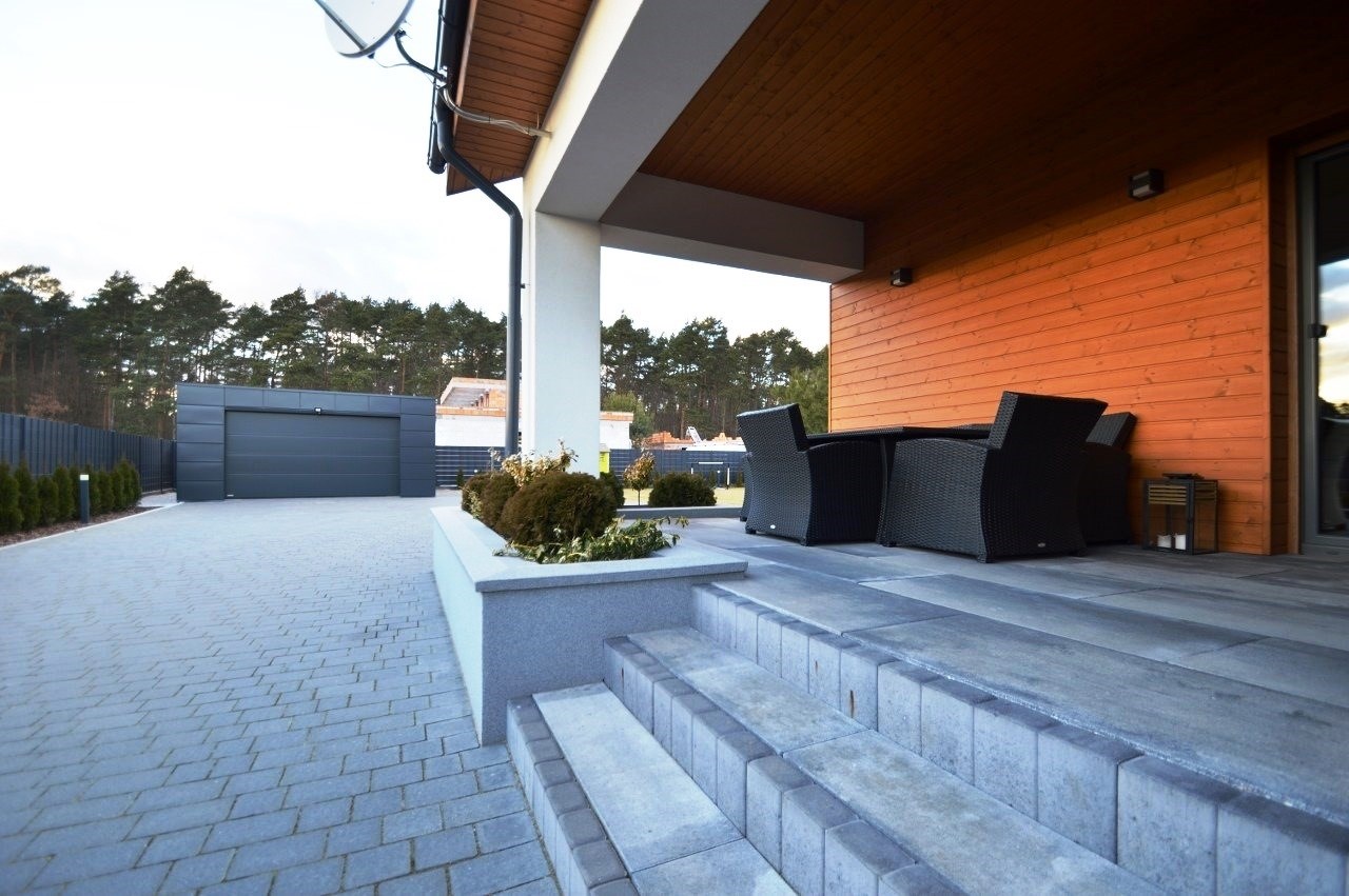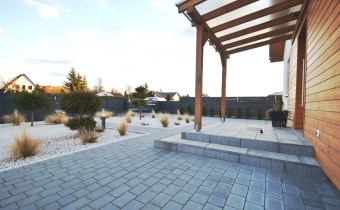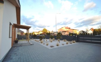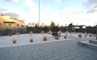 Na działce liczne nasadzenia, oświetlenie ogrodowe, utwardzone ciągi komunikacyjne kostką brukowa, nawadnianie ogrodu z własnego ujęcia