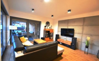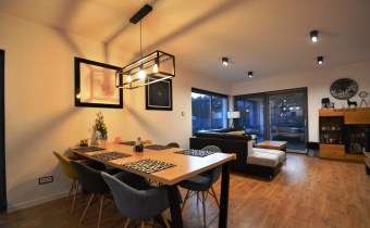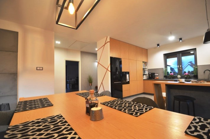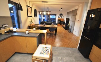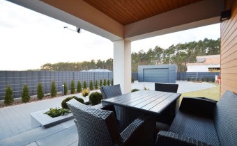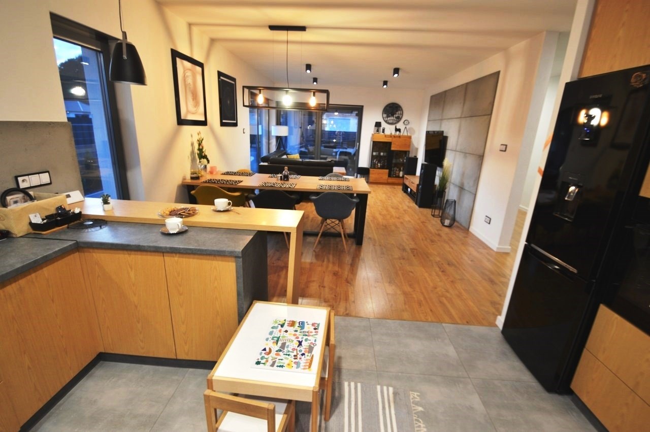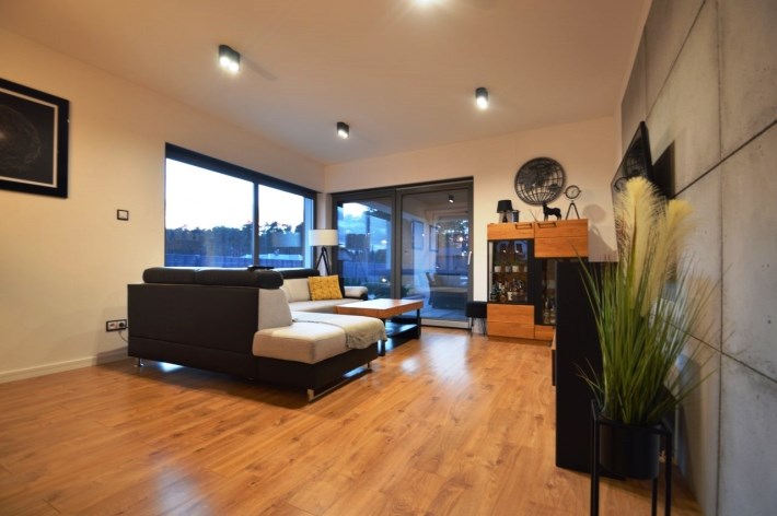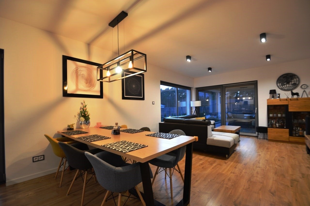 Salon z jadalnią o pow. 30,94m2 - na podłodze panele. duże witryny od strony zachodnio-północnej, wyjście na zadaszony taras, wyłożony kostką brukową