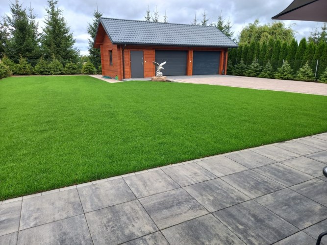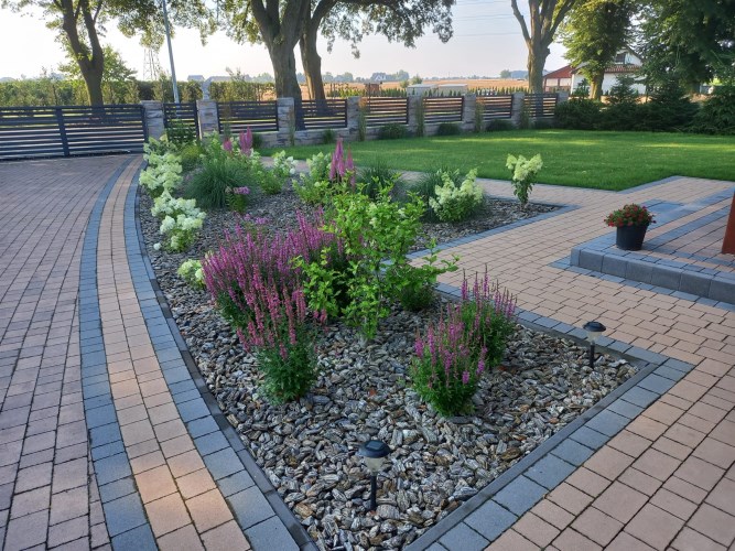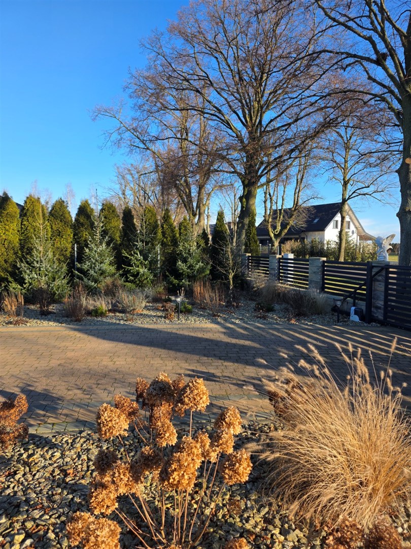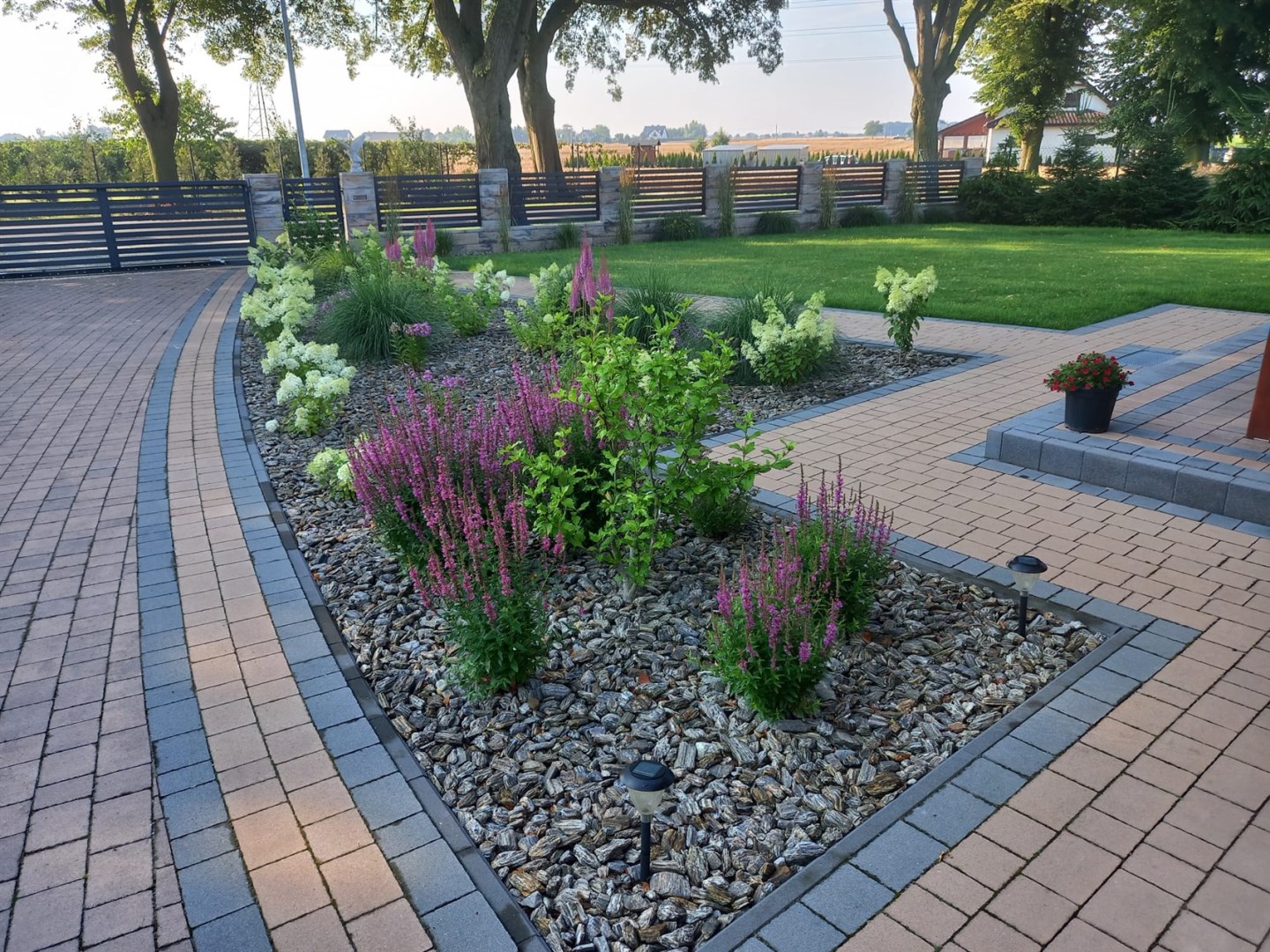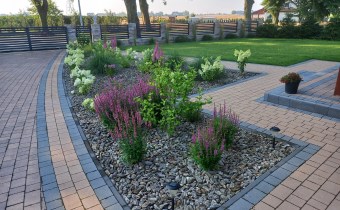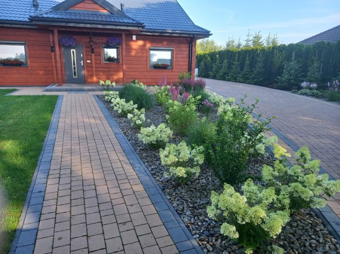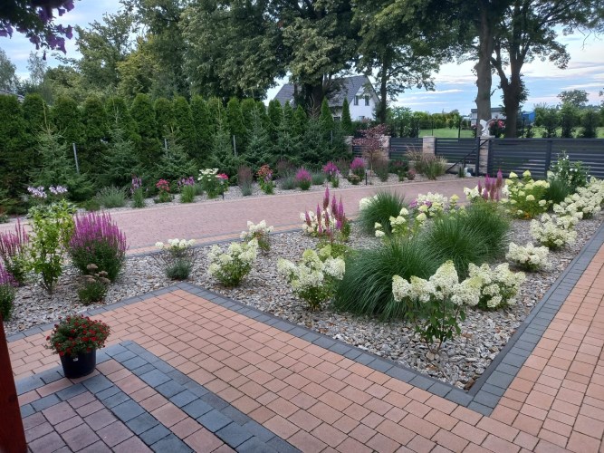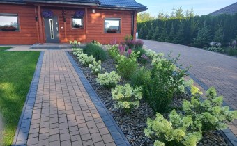 liczne, starannie dobrane nasadzenia, kwiaty i świerki