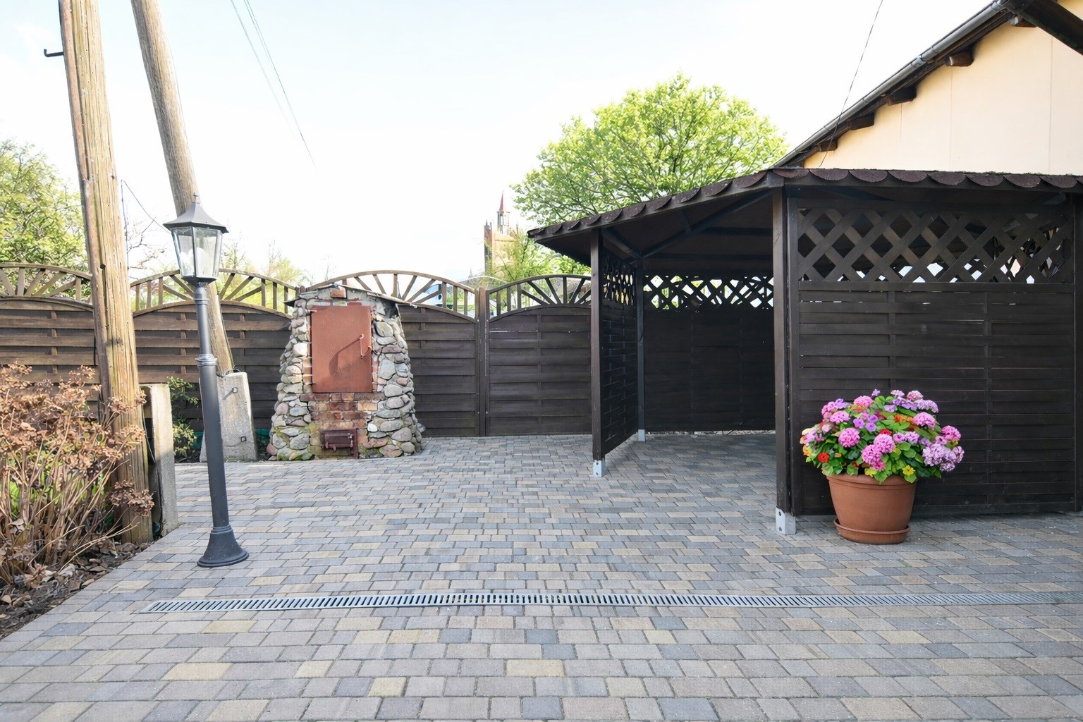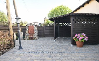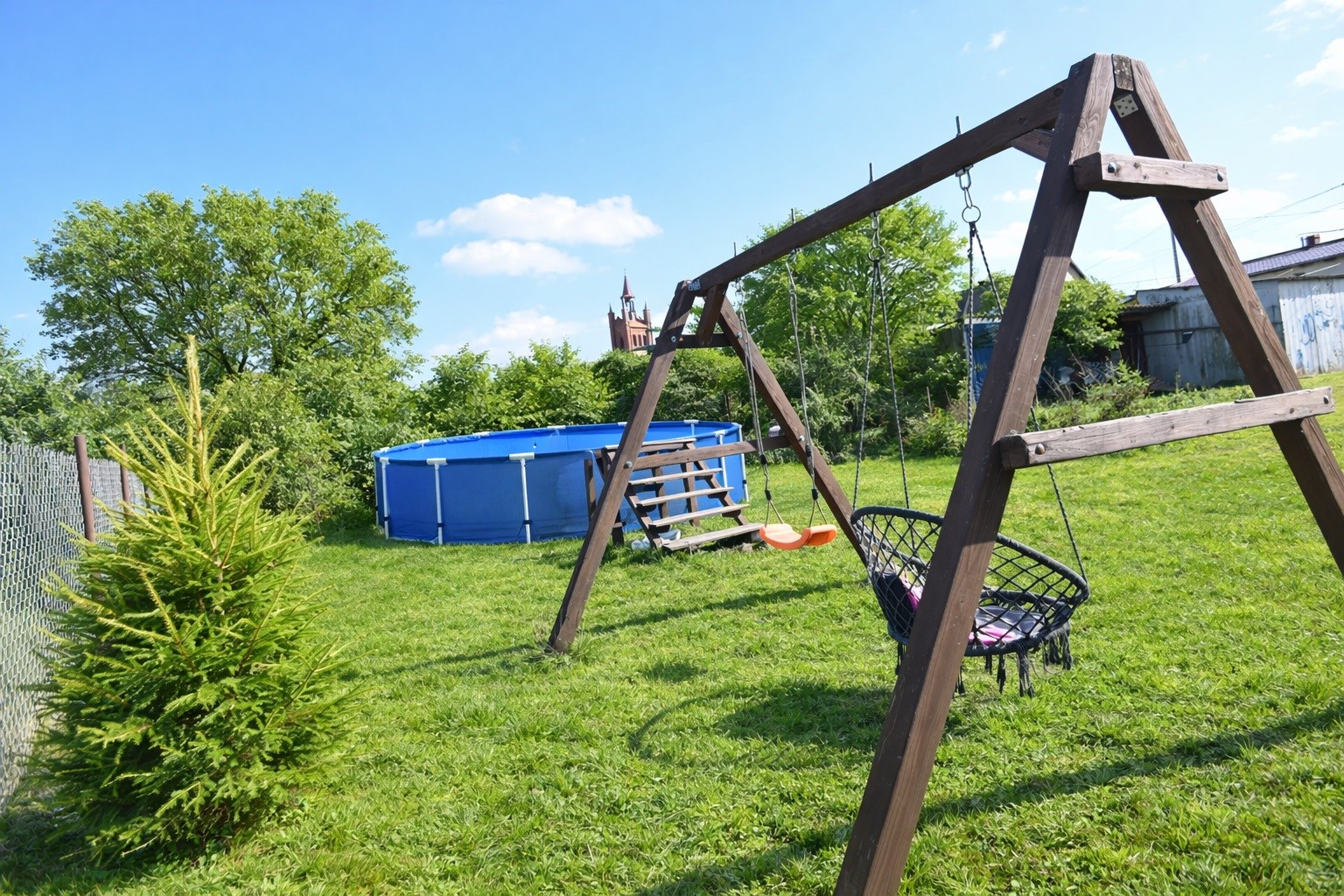 Na zagospodarowanej działce znajduje się garaż z kanałem, kilka pomieszczeń gospodarczych, wiata wypoczynkowa, miejsce na ognisko oraz drewniany podest do basenu. Teren jest w całości ogrodzony, a wjazd na posesję prowadzi przez solidną metalową bramę.