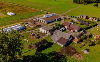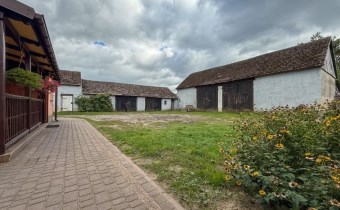 - Ciąg budynków gospodarczych (260 m²) – kotłownia, magazyn zboża, mieszalnia, śrutownik, garaż, kurnik, piwnica