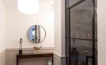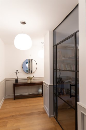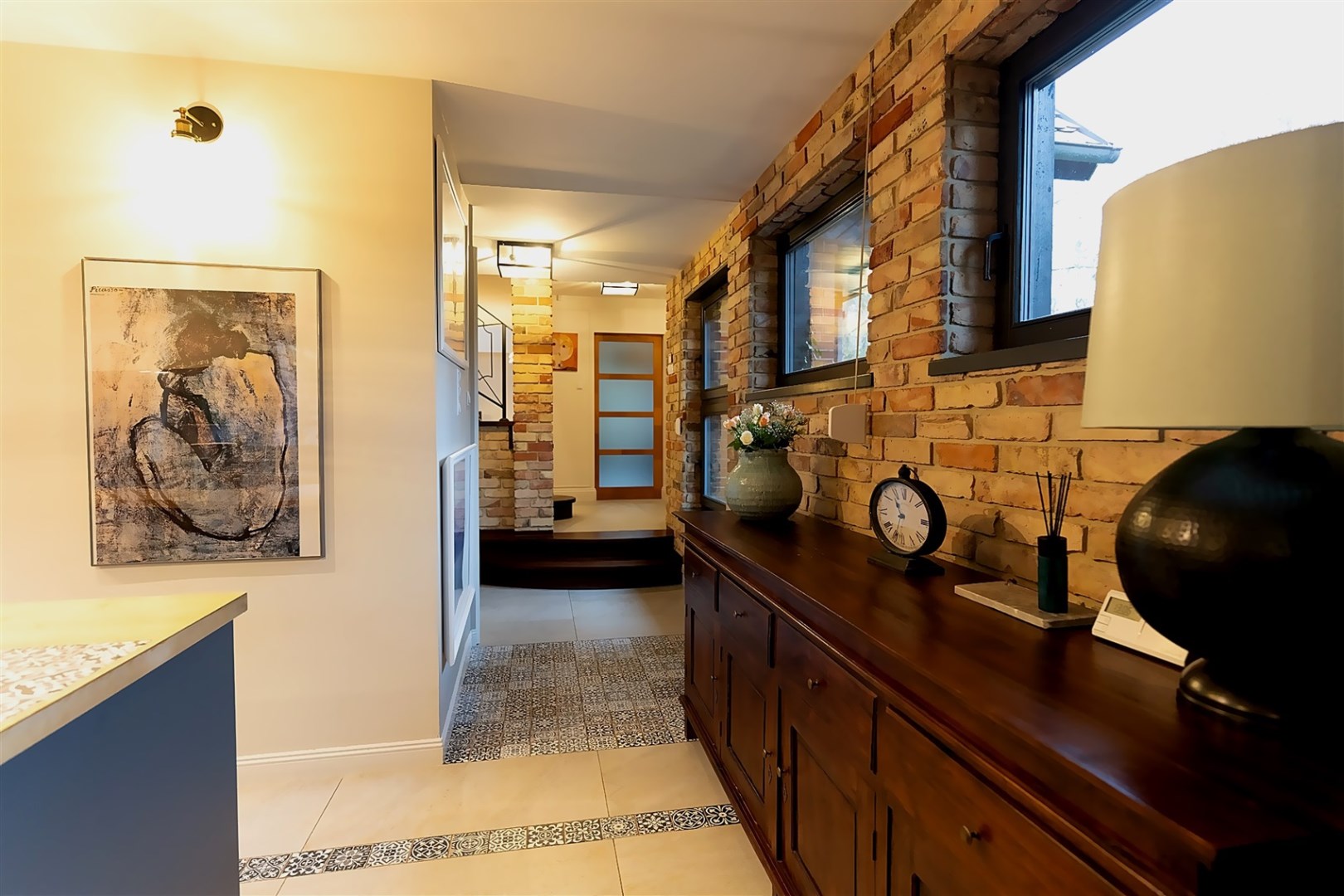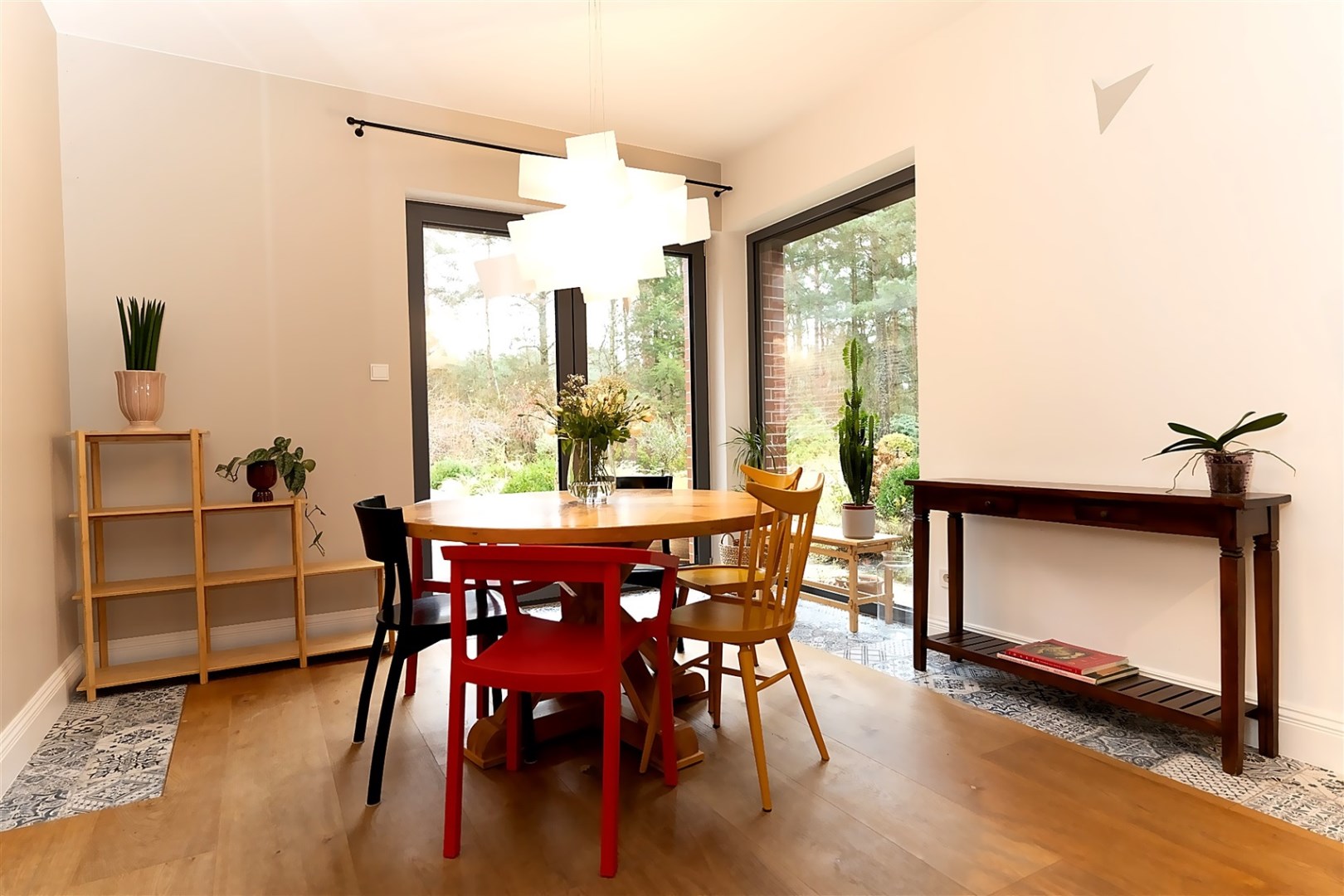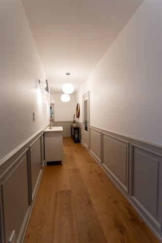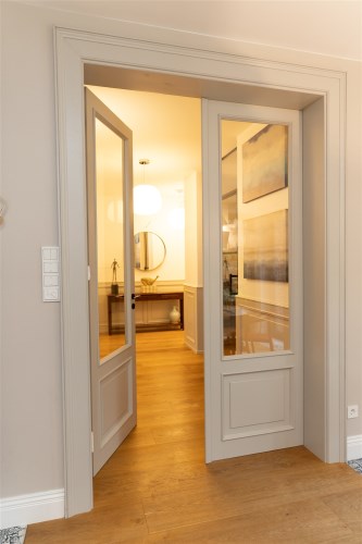 Do kolejnej części domu prowadzą nas z kuchni z jadalnią stylowe drewniane drzwi z dużym przeszkleniem za którymi znajdują się: