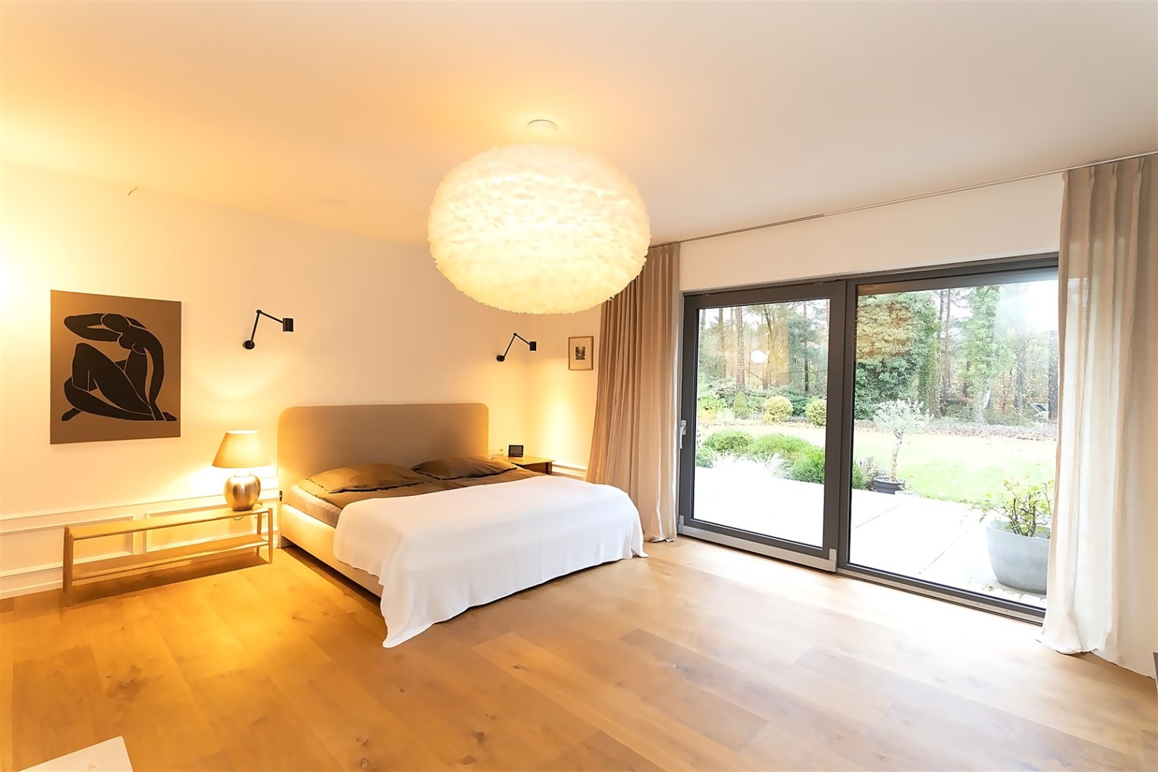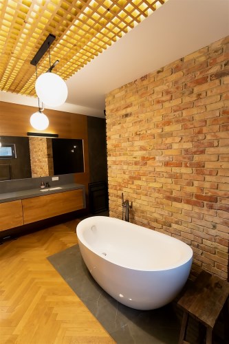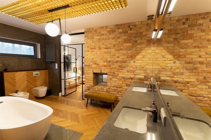 Wyjątkowa sypialnia z pokojem kąpielowym. Duża sypialnia z widokiem na ogród i wyjściem na taras na którym poranili z kawą są wyjątkowe. Pokój kąpielowy z gustowna wanna wolnostojącą i częścią z natryskiem. Pokój kąpielowy z dużymi lustrami, elementami drewna i stylowej cegły
