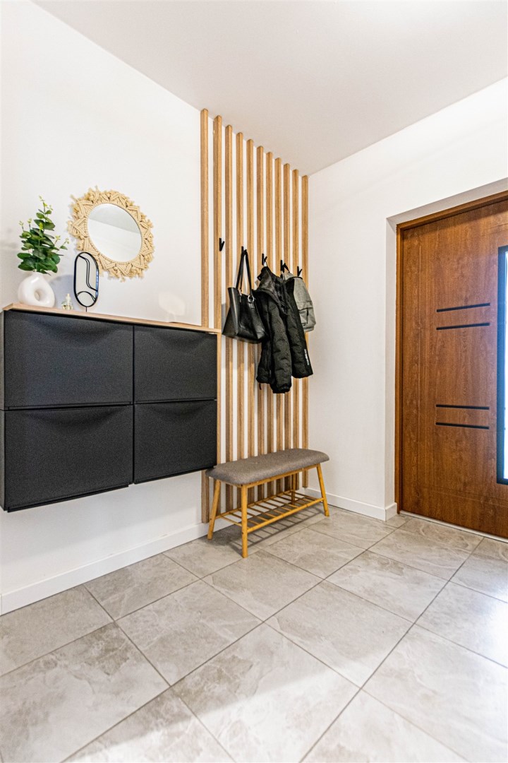 W części dziennej domu: salon, kuchnia, przedpokój, wiatrołap oraz łazienka i wc na podłodze kafle gresowe szkliwione.