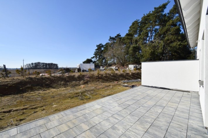 Pomiędzy tarasami z drugim lokalem zrobiona jest murowana ścianka.