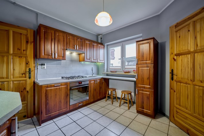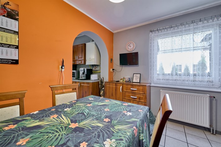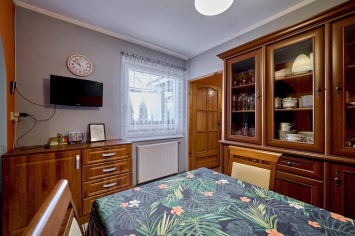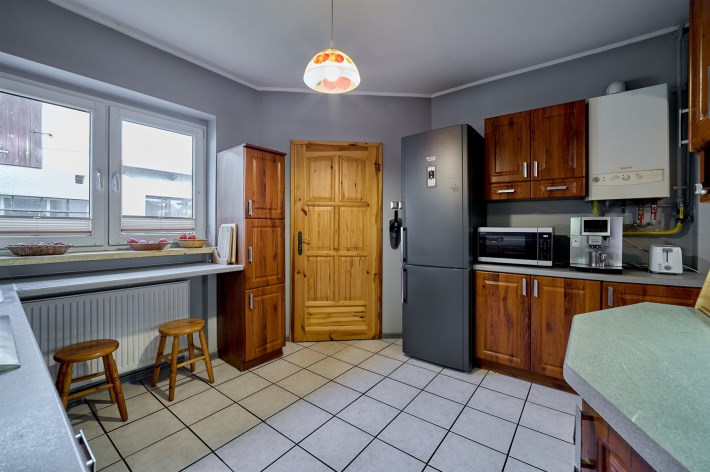 - jadalnia (9,04 m²) połączona z funkcjonalną kuchnią (11,49 m²) wyposażoną w piec gazowy II-funkcyjny,