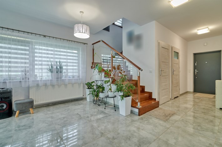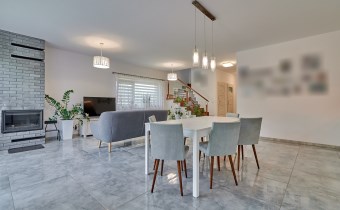 Na wyposażeniu pozostaje między innymi: w kuchni meble na wymiar wraz ze sprzętem w zabudowie (poza lodówką), w garderobie zabudowa pod wymiar - otwarte półki, szafa garderobiana w pokoju na parterze, meble z sypialni właścicieli i pokoi dzieci.