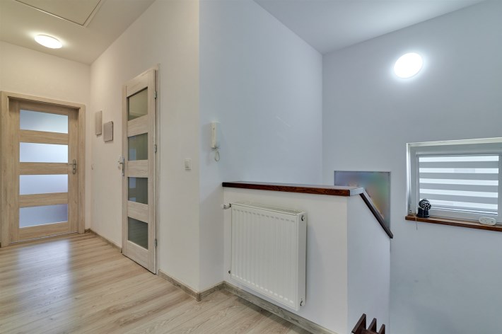 Z korytarza na piętrze wejście po opuszczanych schodach na poddasze.