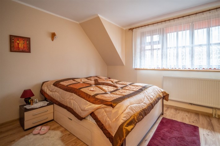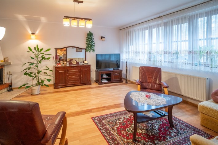 Nieruchomość o pow. użytkowej 182,1m2 wybudowana metodą tradycyjną (murowana z betonu komórkowego), dach konstrukcji drewnianej kryty dachówką cemantową. Stolarka okienna drewniana. Na podłodze panele oraz terakota