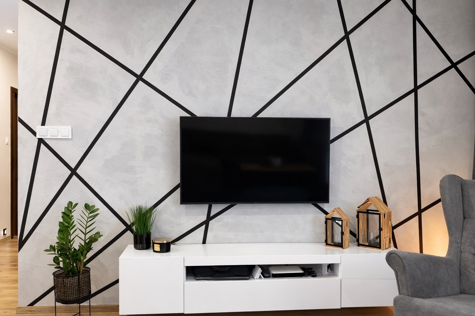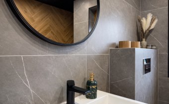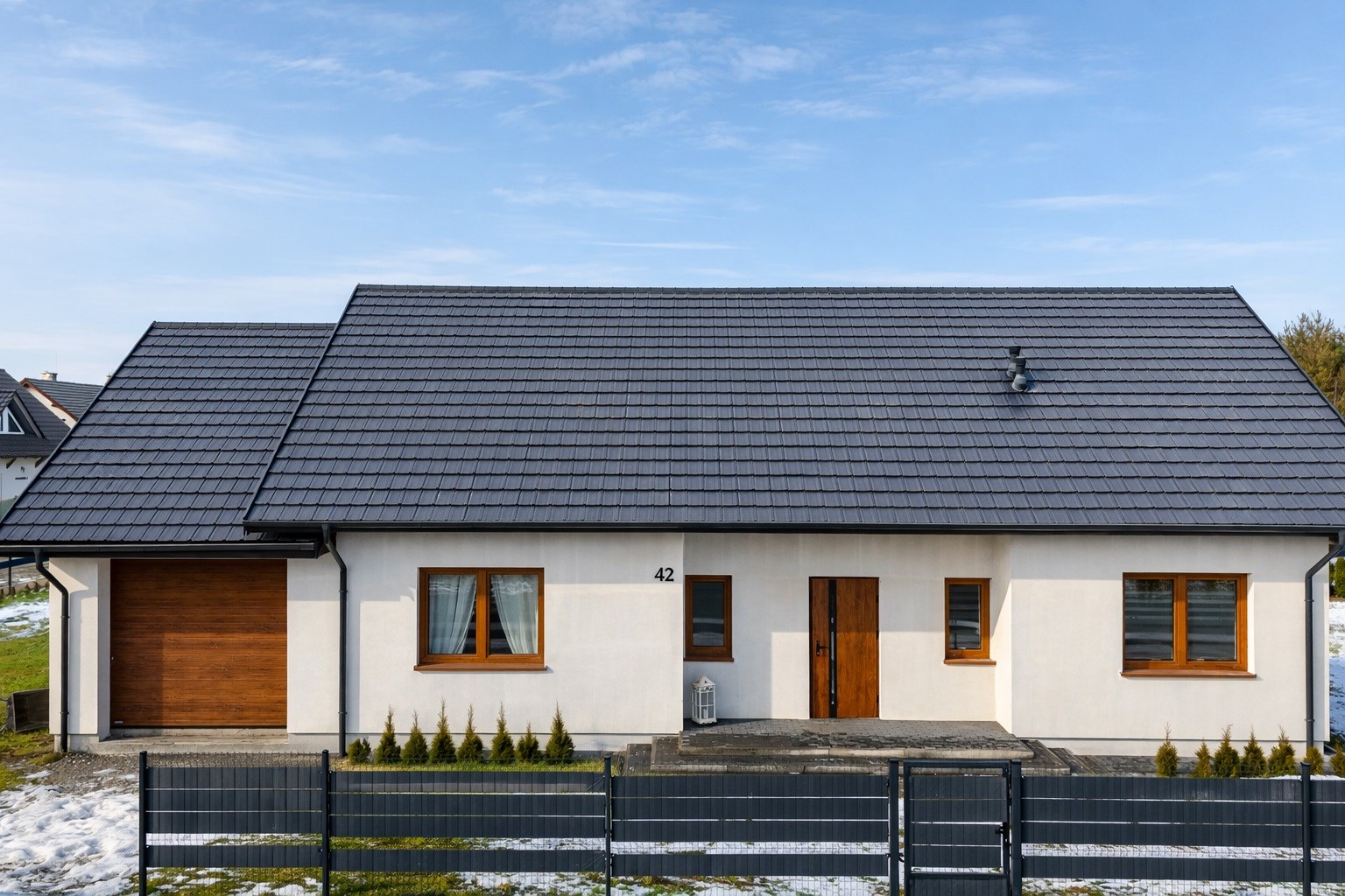 Dom jest urządzony w nowoczesnym, klasycznym stylu — ponadczasowa elegancja wnętrz łączy się z funkcjonalnością.