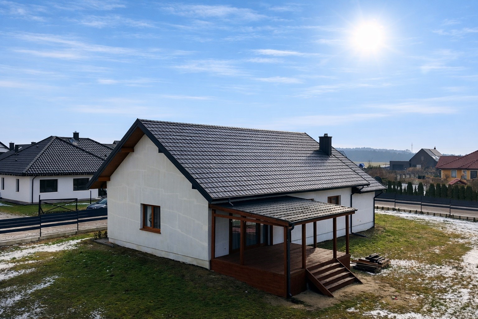 Taras wyłożony deską tarasową i zadaszony blachodachówką tworzy idealne miejsce do relaksu lub spotkań z rodziną i znajomymi.