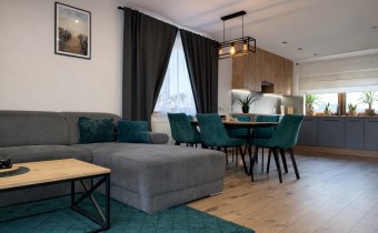 Kuchnia wyposażona jest w zabudowę ze sprzętami AGD: lodówka, zmywarka, płyta indukcyjna, okap, piekarnik
