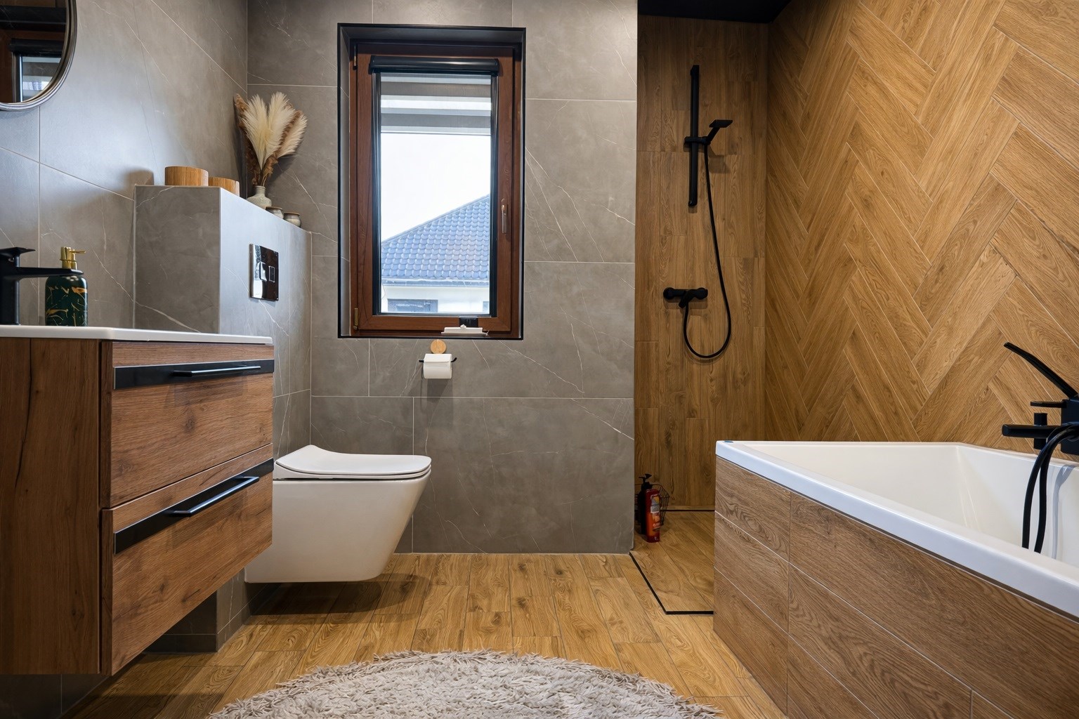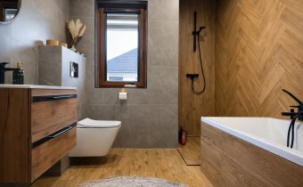 W łazience nowoczesna armatura, umywalka, prysznic podłogowy i wanna podkreślają komfort codziennego użytkowania.