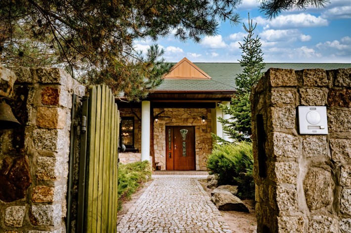 Front z murowanym ogrodzeniem i bramą na pilota, w środku – zieleń, kwiaty, szklarnia, wędzarnia.