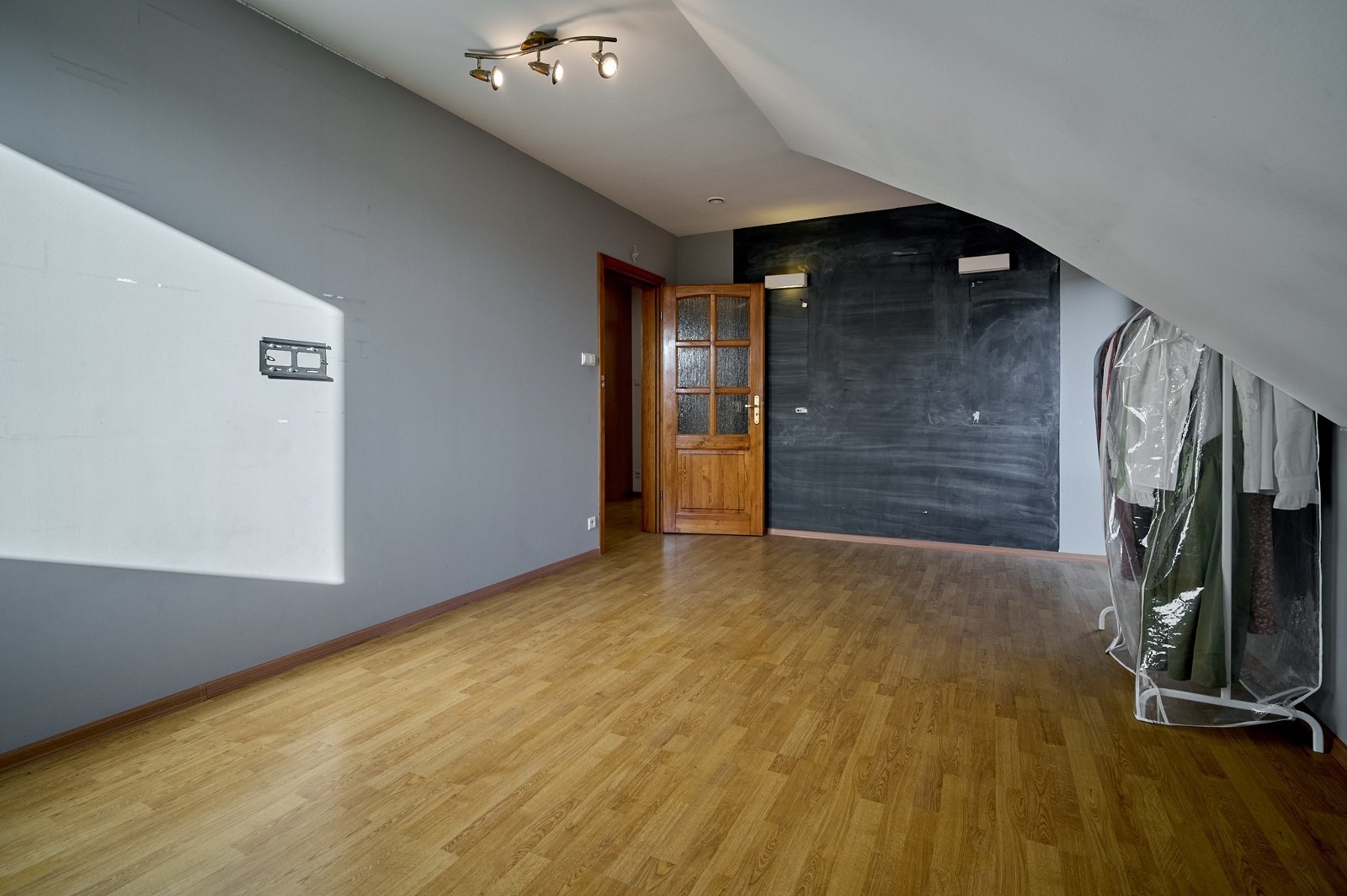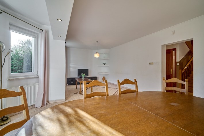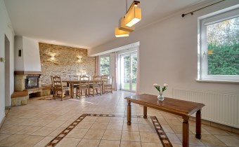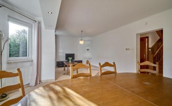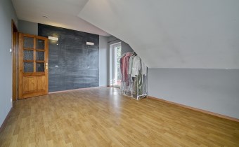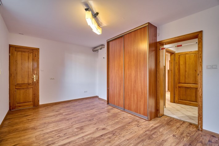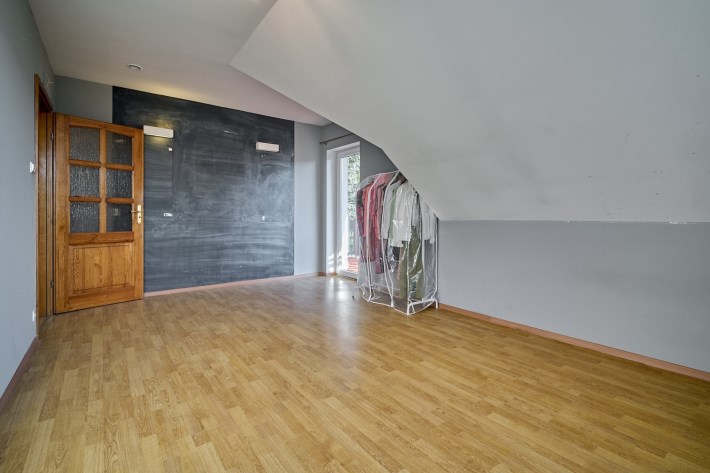 Garaż w bryle budynku, obecnie zaadaptowany na dodatkowy pokój, świetnie sprawdzi się również jako gabinet, studio lub pomieszczenie pod niewielką działalność.