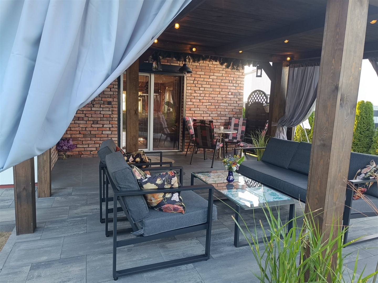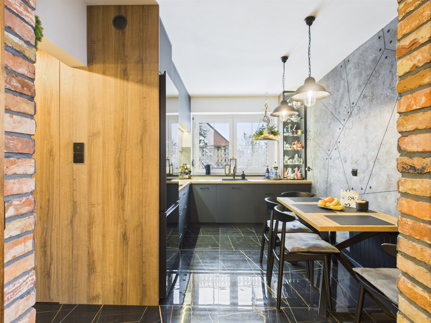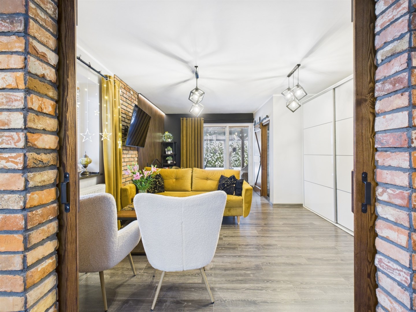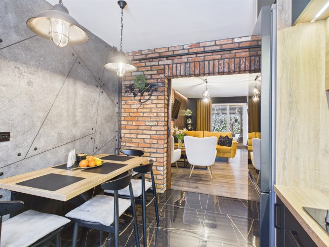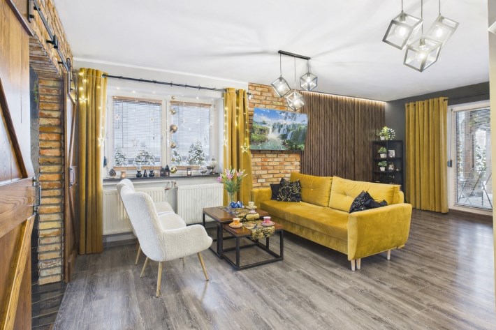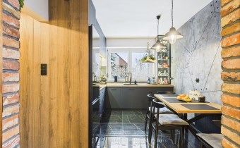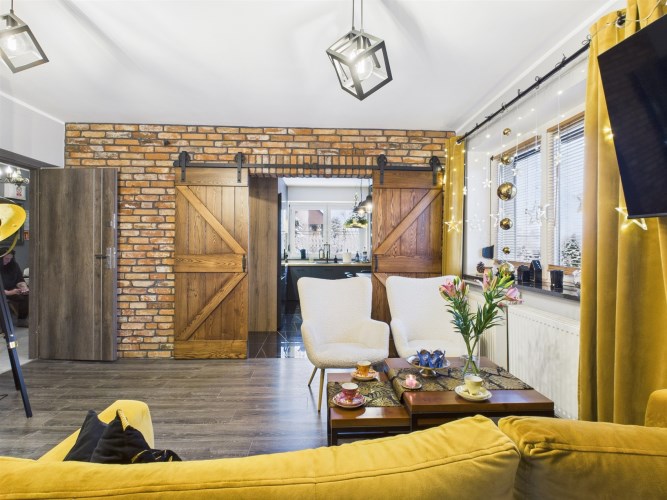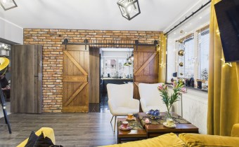 W aranżacji domu wykorzystano m.in. 120-letnią cegłę, nadającą przestrzeni niepowtarzalnego stylu i ciepła. Całość dopełniają piękne detale, takie jak drewniane drzwi przesuwne prowadzące do kuchni i łazienki – rozwiązanie zarówno efektowne, jak i praktyczne.