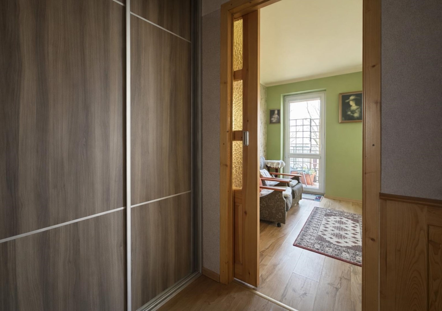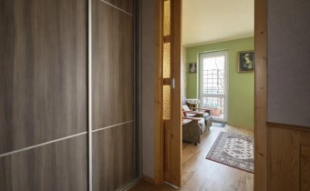 - salon: 16,12 m² (stylowe, drewniane drzwi przesuwne, wyjście na balkon),