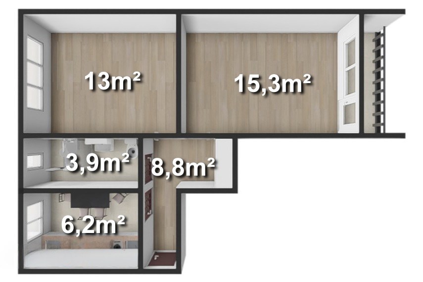 - Salon 15,30 m² - jasny, ustawny, z wyjściem na duży balkon, idealny na poranną kawę lub wieczorny relaks