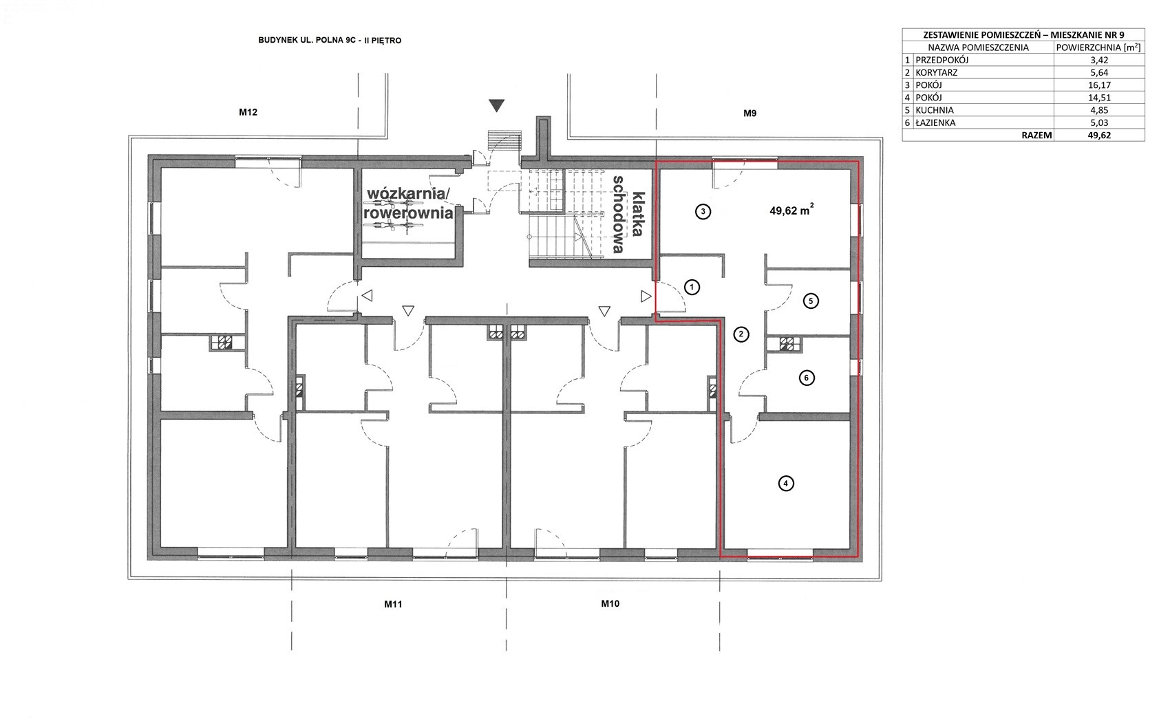 Powierzchnia lokalu mieszkalnego wynosi 49,62 m2, w skład którego wchodzi: