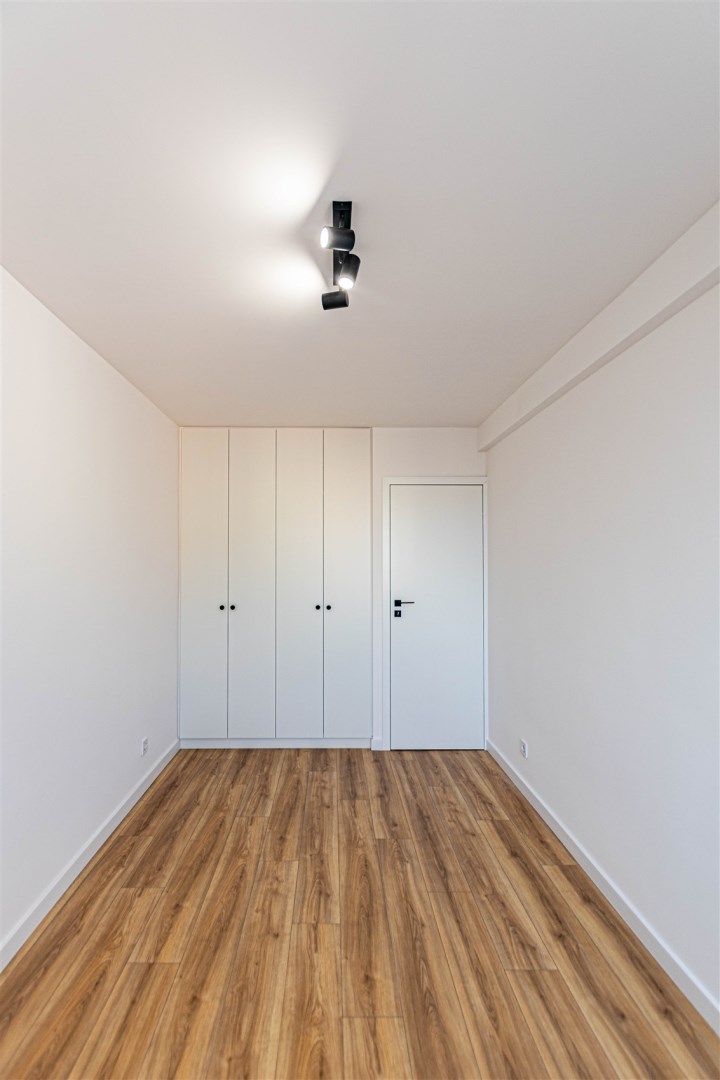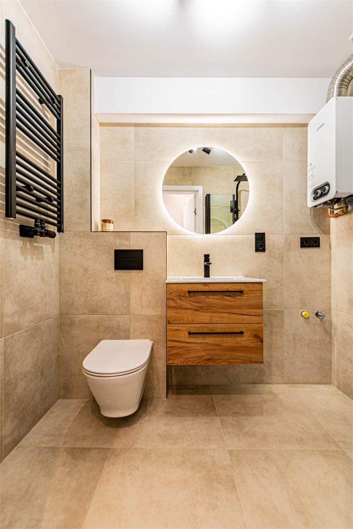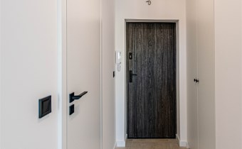 Nowoczesne drzwi wewnętrzne oraz punkty świetlne w całym mieszkaniu.