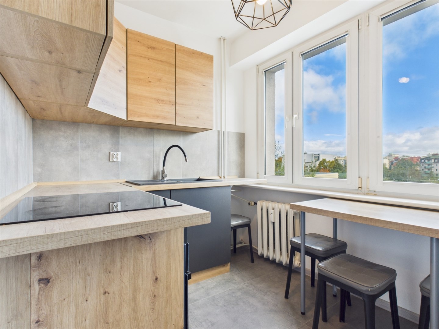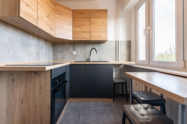 Nieruchomość oferowana jest z kompletną zabudową kuchenną oraz sprzętem AGD – piekarnikiem, płytą indukcyjną i lodówką. Wystarczy wstawić meble do pokoi, by cieszyć się gotowym do zamieszkania wnętrzem.