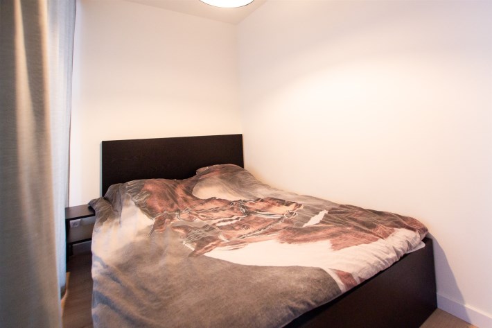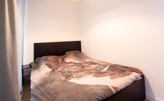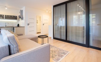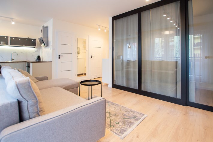 Za przesuwnymi szklanymi drzwiami została wydzielona sypialnia.