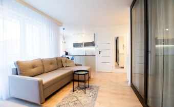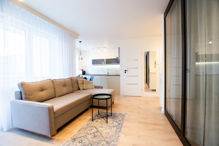 W części dziennej, wypoczynkowej mamy stylowy narożnik i wyjście na duży balkon o pow. 5,35 m2