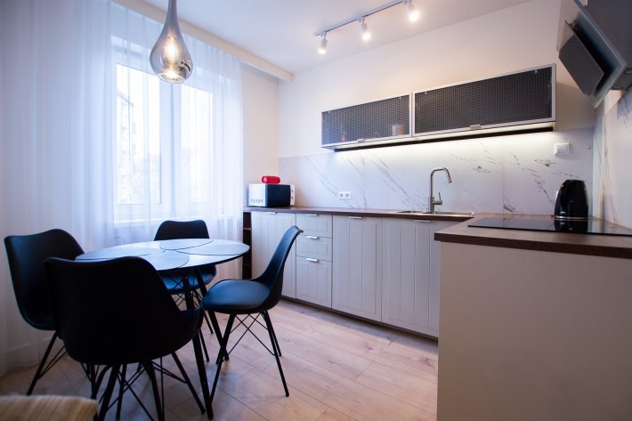 Kuchnia z oknem i jasną zabudową wraz z miejscem na wygodny stół z krzesłami.
