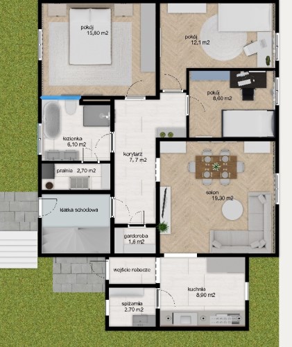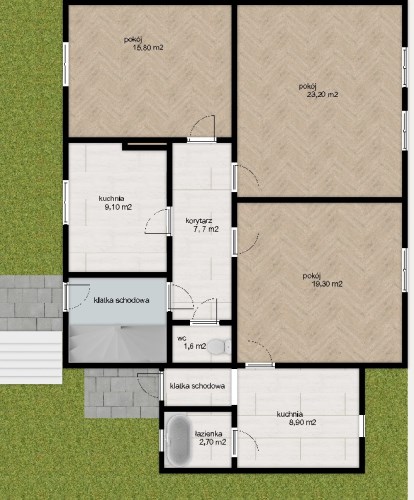Pokój o pow. 23,2 m 2, pokój o pow. 19,30 m2, pokój o pow. 15,80 m2, kuchnia o pow. 9,10 m2, druga kuchnia o pow. 8,9 m2, łazienka o pow. 2,70 m2, wc o pow.1,60 m2.