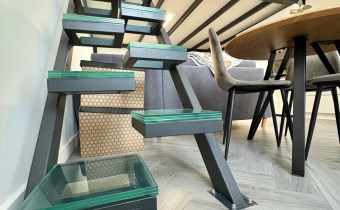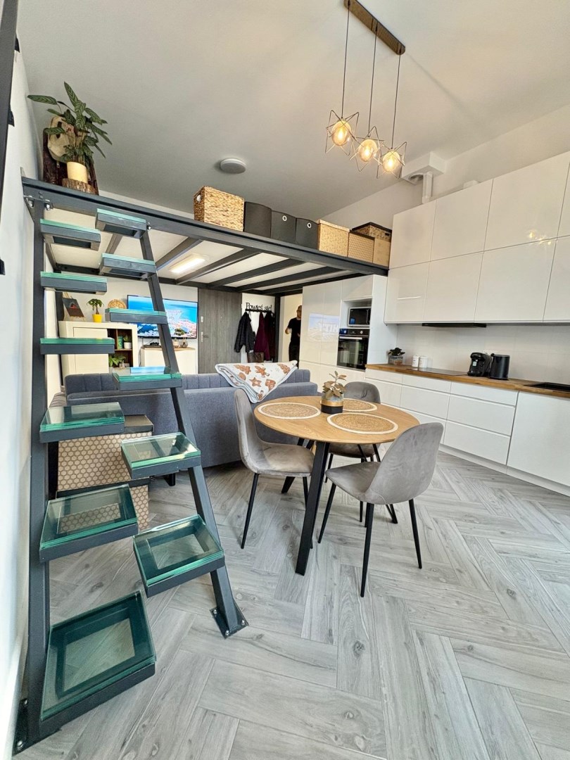 Nowoczesna kawalerka o powierzchni 38 m² z antresolą (ok. 10 m²) w budynku z 2022 roku przy ul. Kołobrzeskiej w Pile. Wysokie na 3,5 m wnętrze tworzy przestronną, industrialną atmosferę.