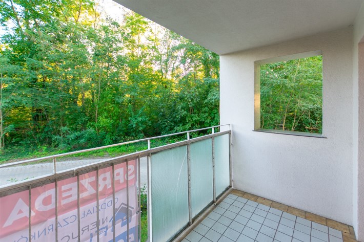 Wyjątkowo przestronny balkon z fantastycznym widokiem na zieleń - tu poranna kawa smakuje jeszcze lepiej.