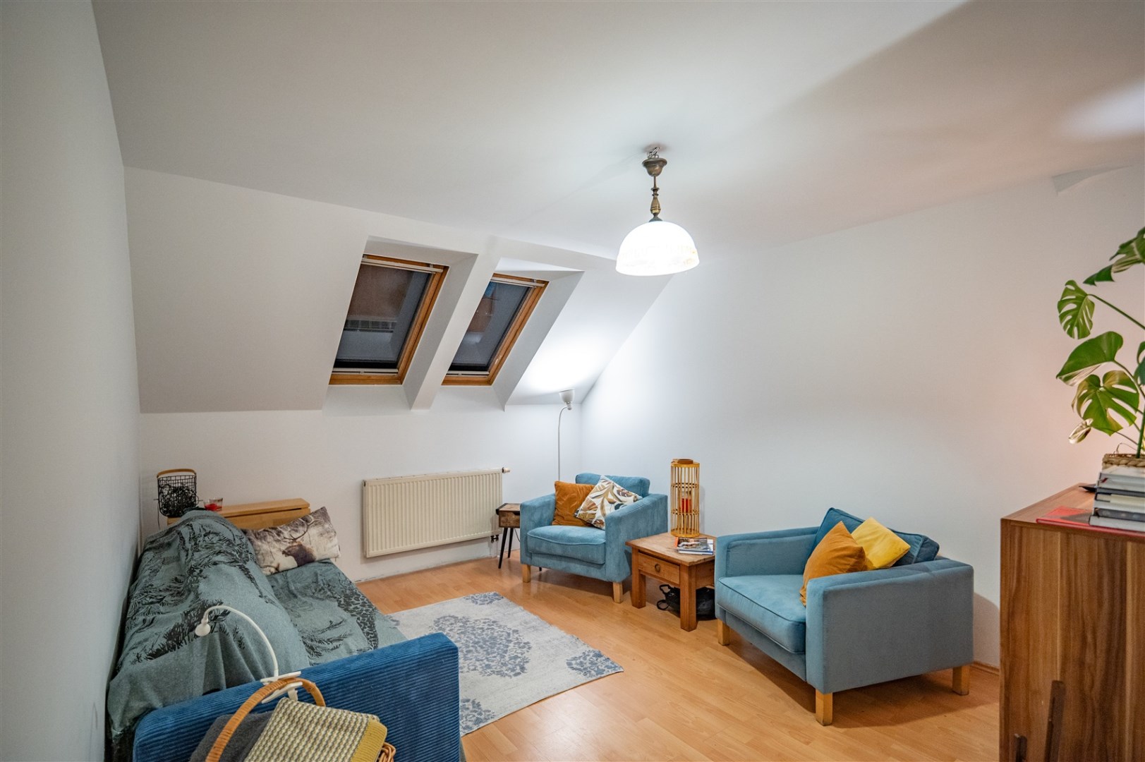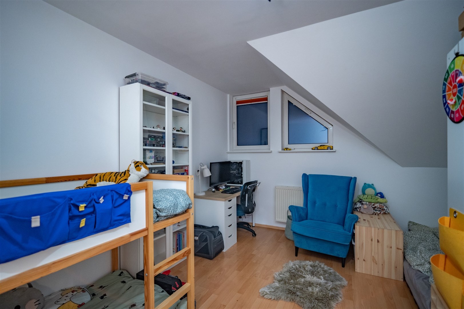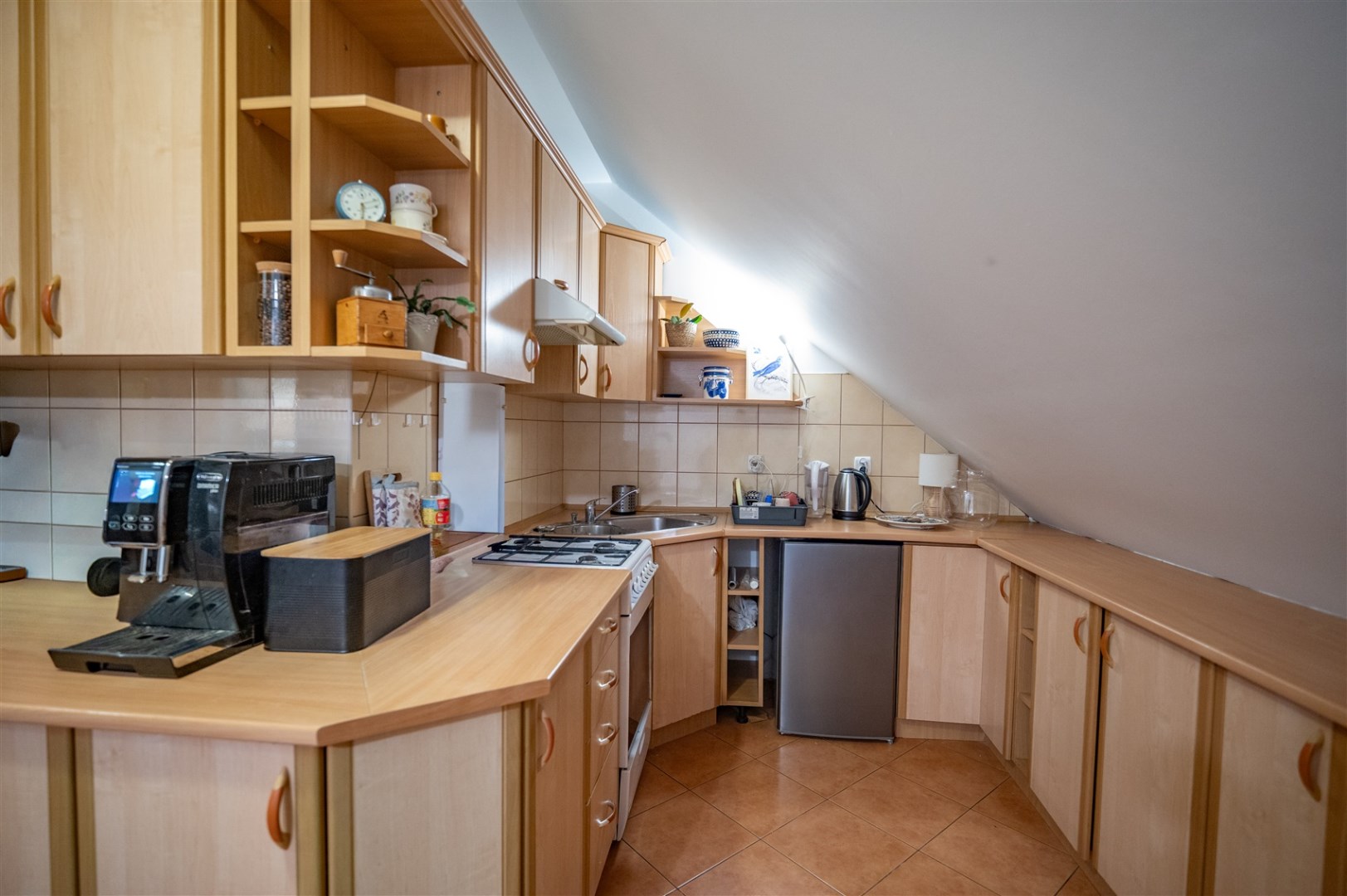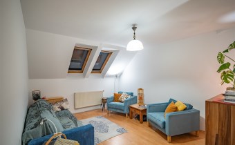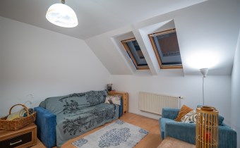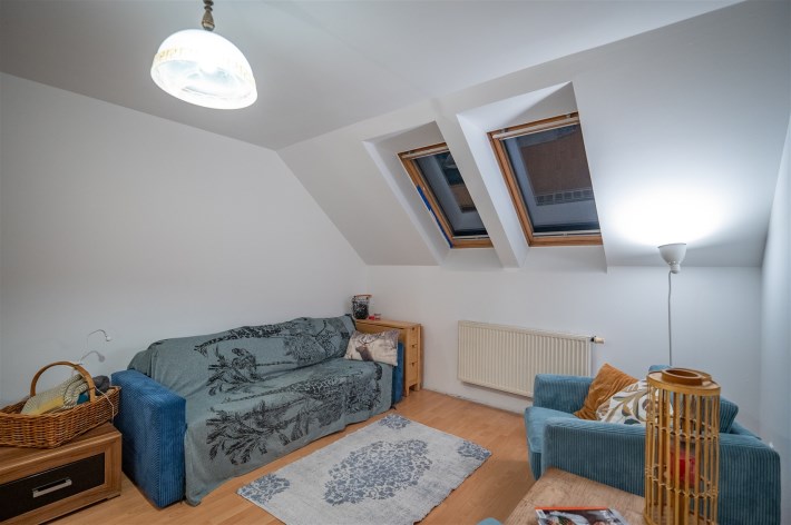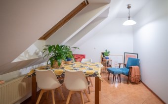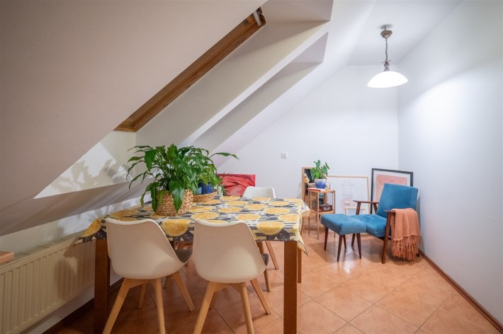 Na podłodze panele, terakota. Stolarka okienna PCV, okna połaciowe drewniane