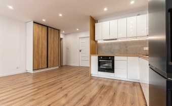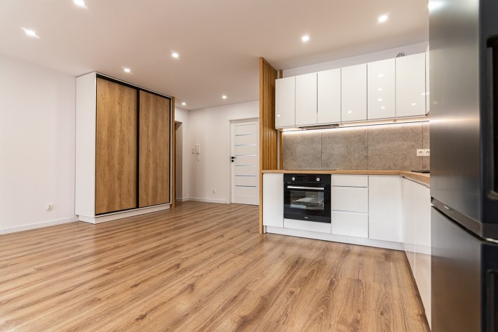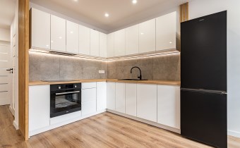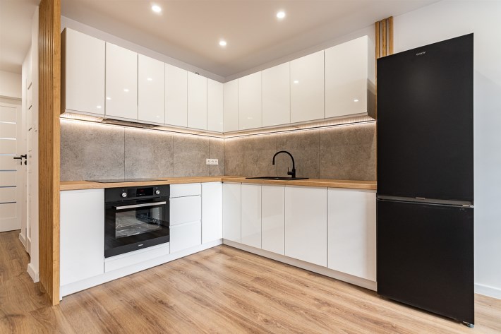 Kuchnia: nowoczesna, w pełni wyposażona – nowa zabudowa meblowa na wymiar, sprzęt AGD: płyta indukcyjna, piekarnik, zmywarka, lodówka.