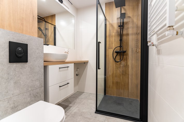 Łazienka: elegancka, z prysznicem, dużym lustrem, podwieszaną szafką z umywalką.