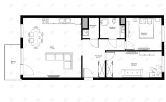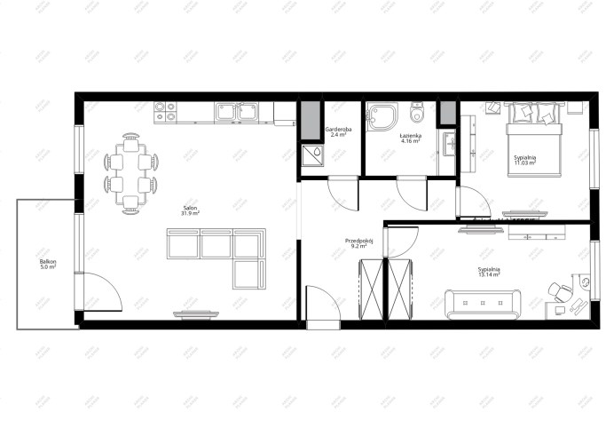 - Salon z aneksem kuchennym o pow. 31,91m2 z wyjściem na duży balkon o pow. 5m2