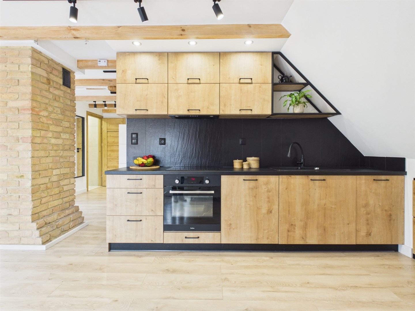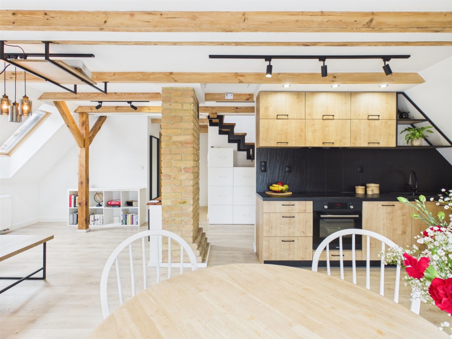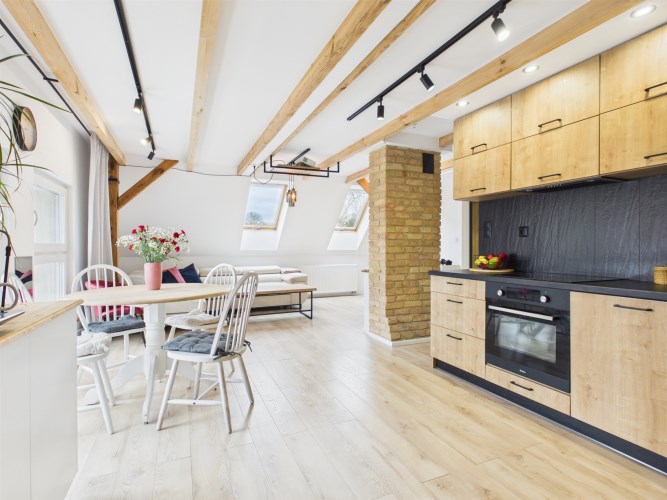 Lokal składa się z przestronnego salonu z w pełni wyposażonym aneksem kuchennym oraz dwóch niezależnych sypialni znajdujących się na piętrze, co zapewnia komfort, spokój i intymność domownikom.