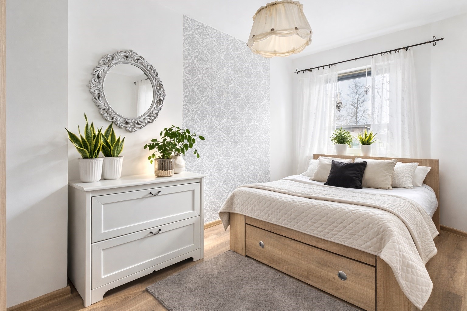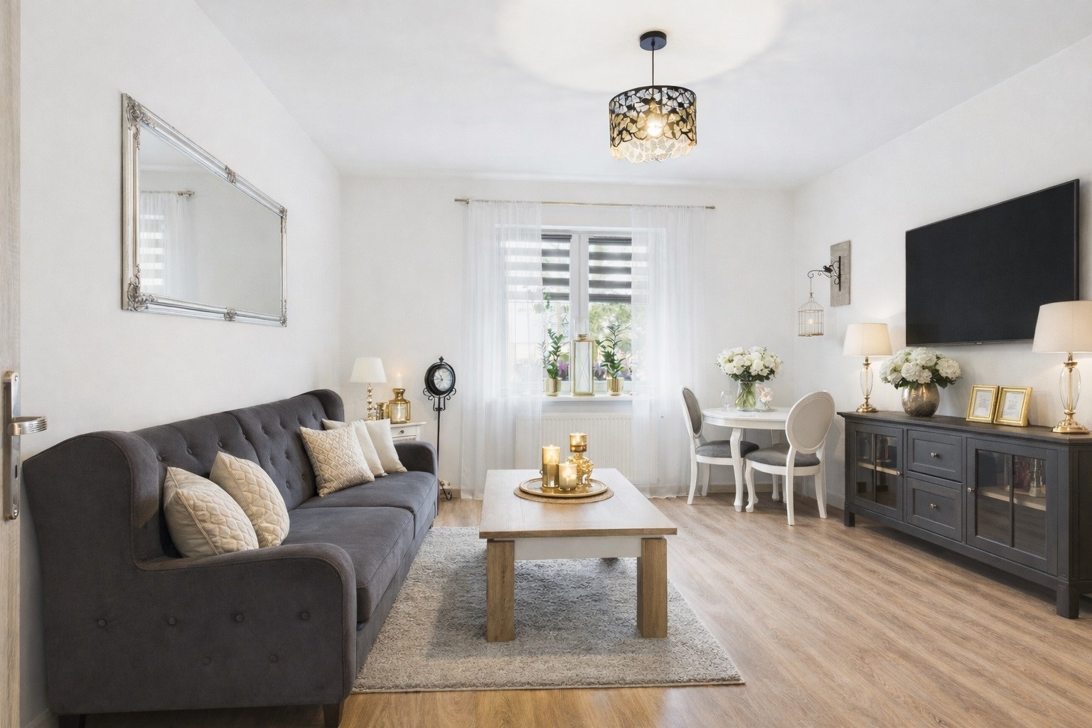 To wnętrze łączy nowoczesność z przytulnością, tworząc wygodną do życia przestrzeń.