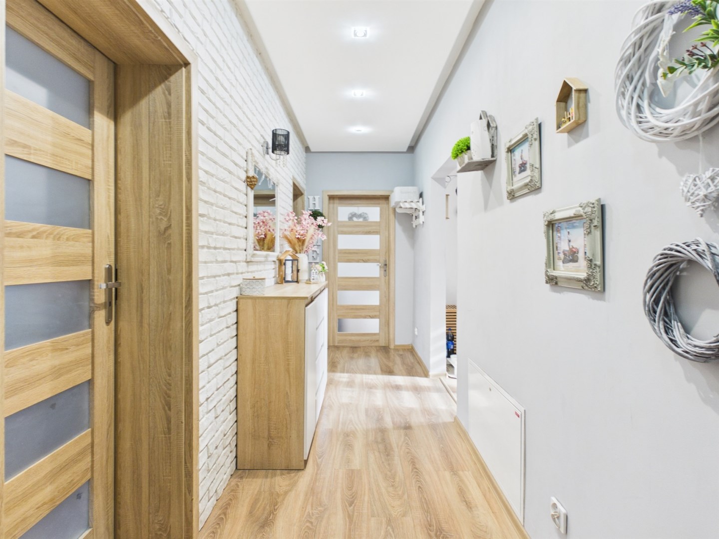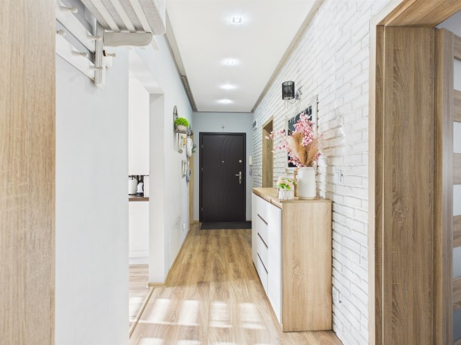 W mieszkaniu zastosowano spójną, jednolitą stolarkę drzwiową oraz estetyczne panele podłogowe tworzące harmonijną całość.