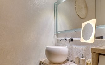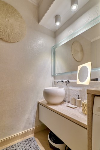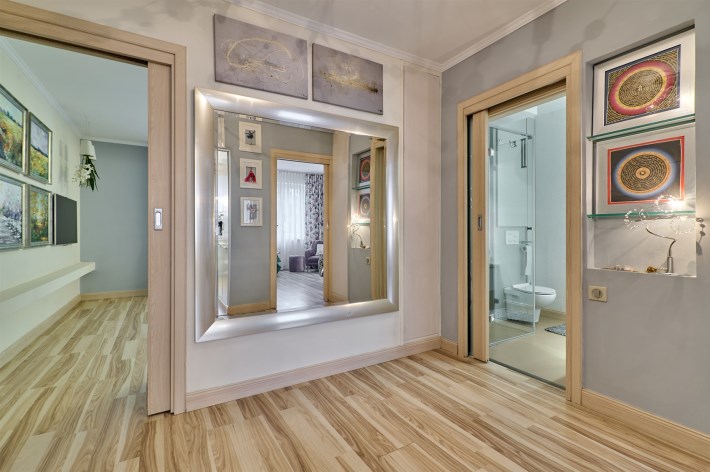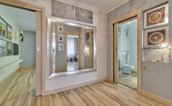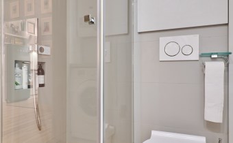 deszczownica z panelem elektronicznym sterującym temperaturą wody firmy Tres. Pokój wyposażony w meble włoskie . W całym mieszkaniu wewnętrzne drzwi przesuwne z matowego szkła. Wszystkie pomieszczenia posiadają osobny sterownik centralnego ogrzewania. W przedpokoju szafki w zabudowie oraz ogromne lustro o pow. 2,30 m2!