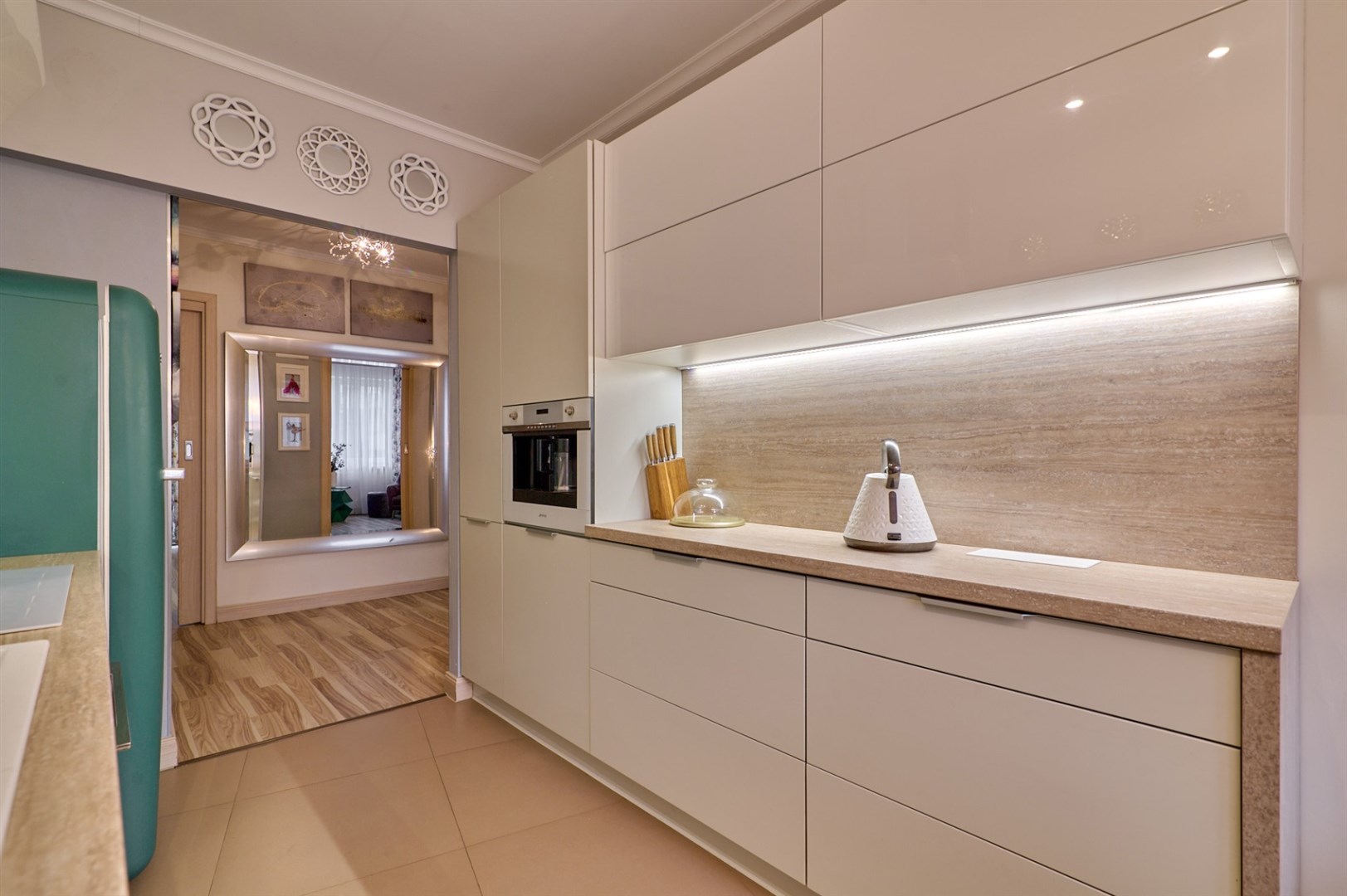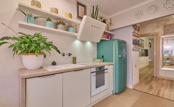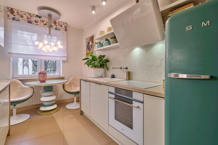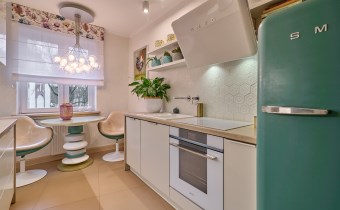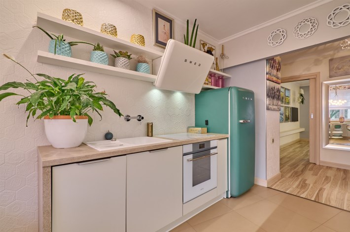 Smeg (lodówka, płyta indukcyjna, okap oraz ekspres do kawy w zabudowie, zmywarka firmy Ariston, armatura firmy Tres.