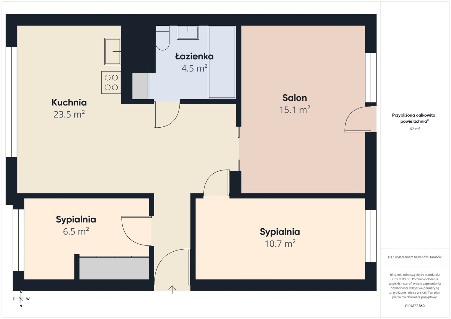 Powierzchnia mieszkania 63,56 m 2 . salon o pow. 16,1 m2 z wyjściem na duży balkon i klimatyzacją,