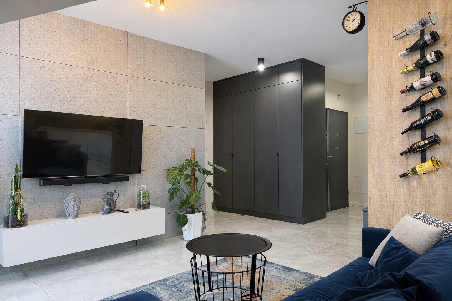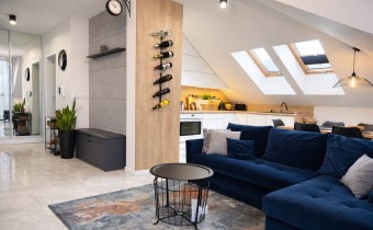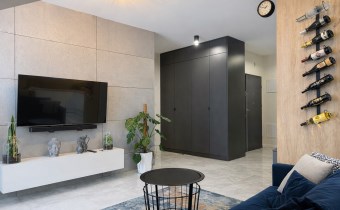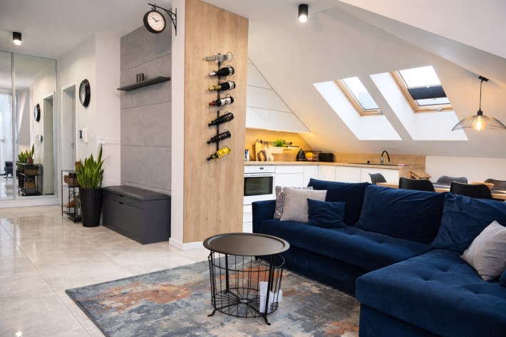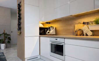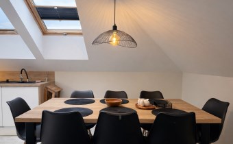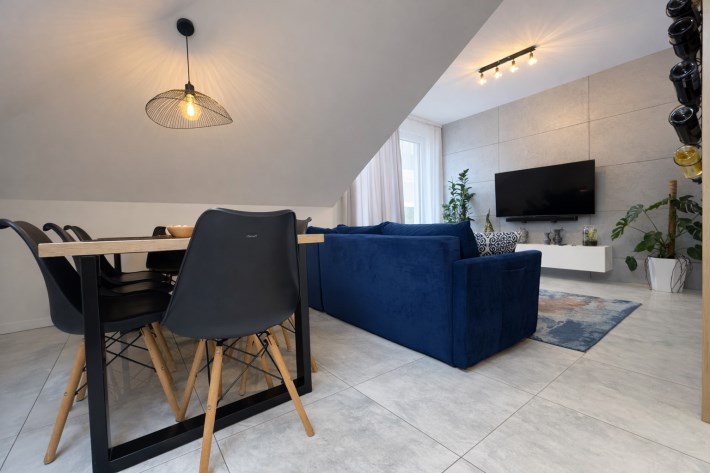 • Przestronny salon z jadalnią i aneksem kuchennym (razem 20 m²),  z dekoracyjną betonową ścianą multimedialną, tworzący centralną, otwartą przestrzeń do codziennego życia i integracji domowników. Kuchnia w pełni wyposażona: meble na wymiar, lodówka, zmywarka, piekarnik i płyta indukcyjna.