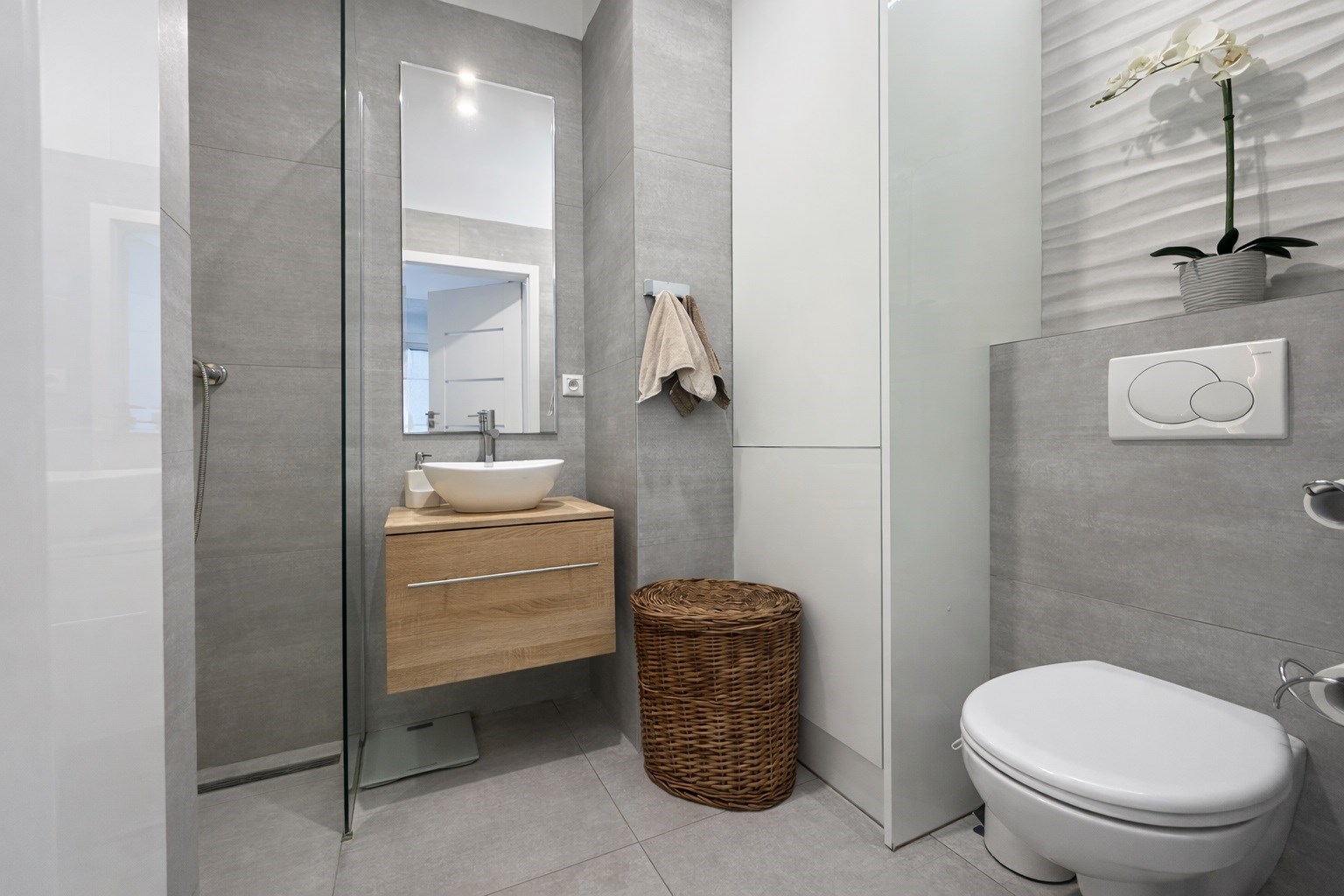 • Łazienka 4,32 m²: nowoczesna, z prysznicem, WC, umywalką oraz praktyczną szafą na pralkę i suszarkę elektryczną.