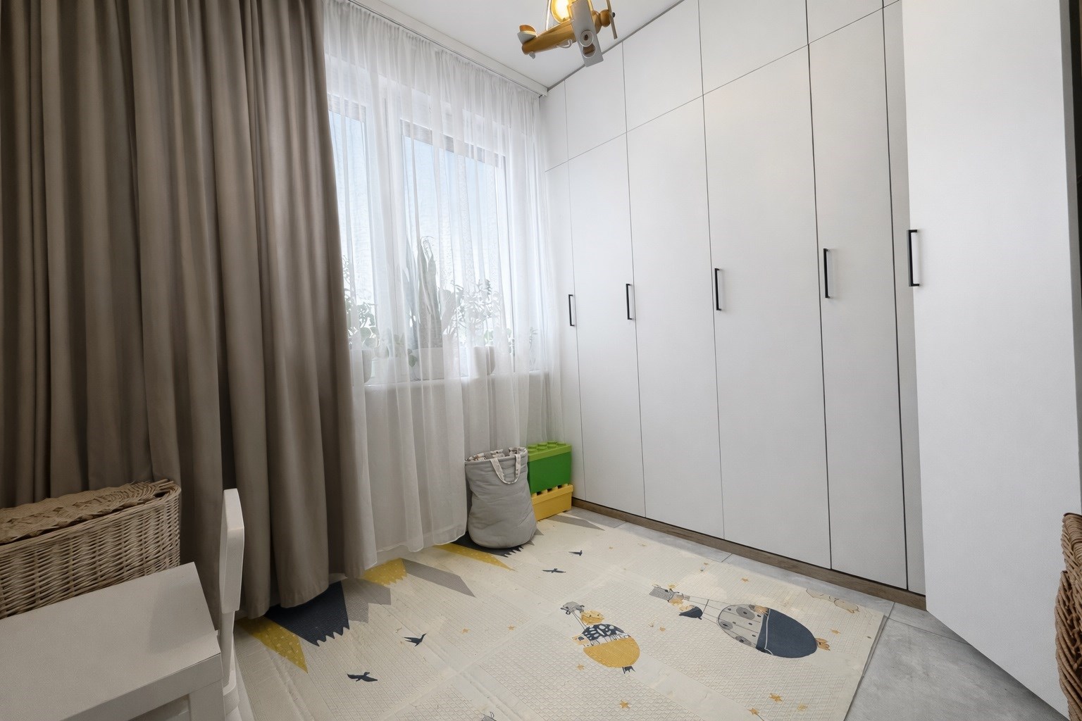 • Druga – 9,23 m², z zabudową (szafa, łóżko rozkładane, biurko).